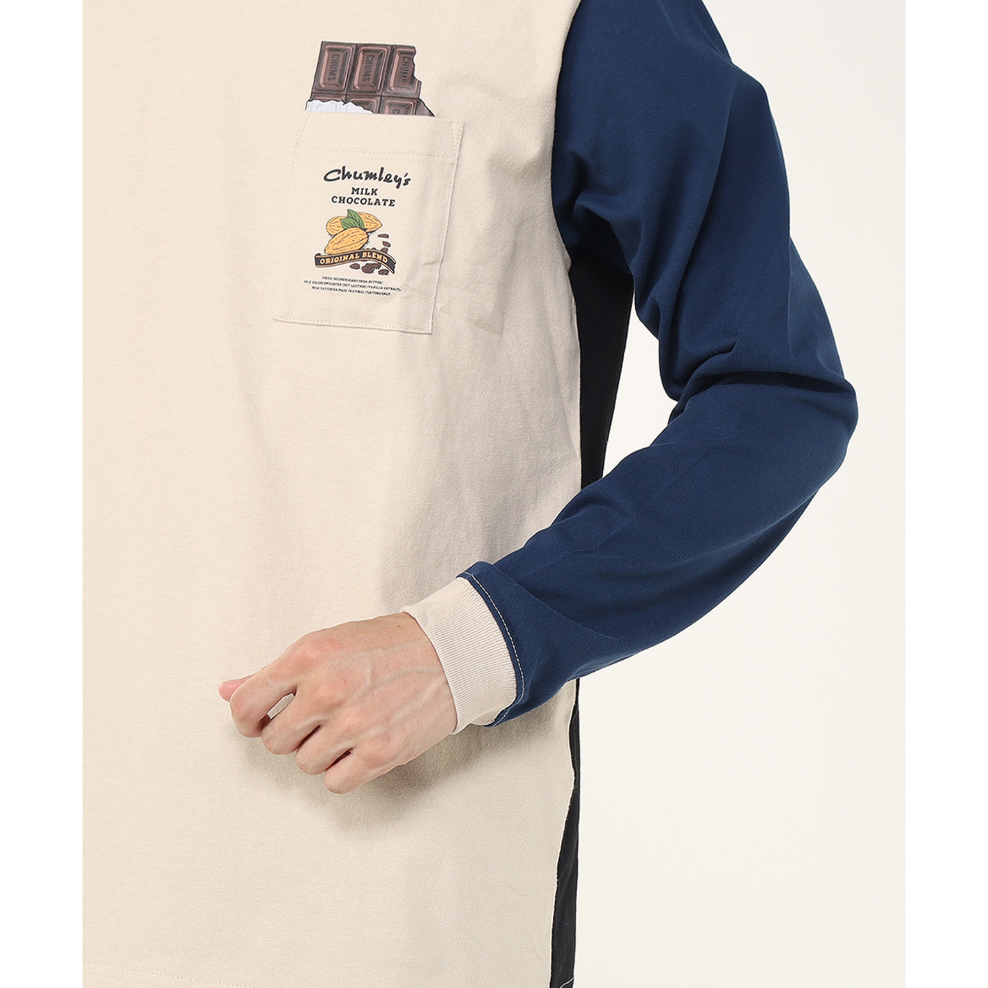 見た目にもあたたかいホットチョコレートをモチーフにしたロングスリーブTシャツ。程よくゆとりのあるボックスシルエット。左胸ポケットはチョコレートのパッケージ風にデザインし、背面にはCHUMSのマグカップにたっぷりと盛り付けられた贅沢なホットチョコレートを大胆にプリント。クッキー、チュロス、マシュマロ、クリーム、そして濃厚なチョコレート。夢のようなコンビネーションが描かれています。