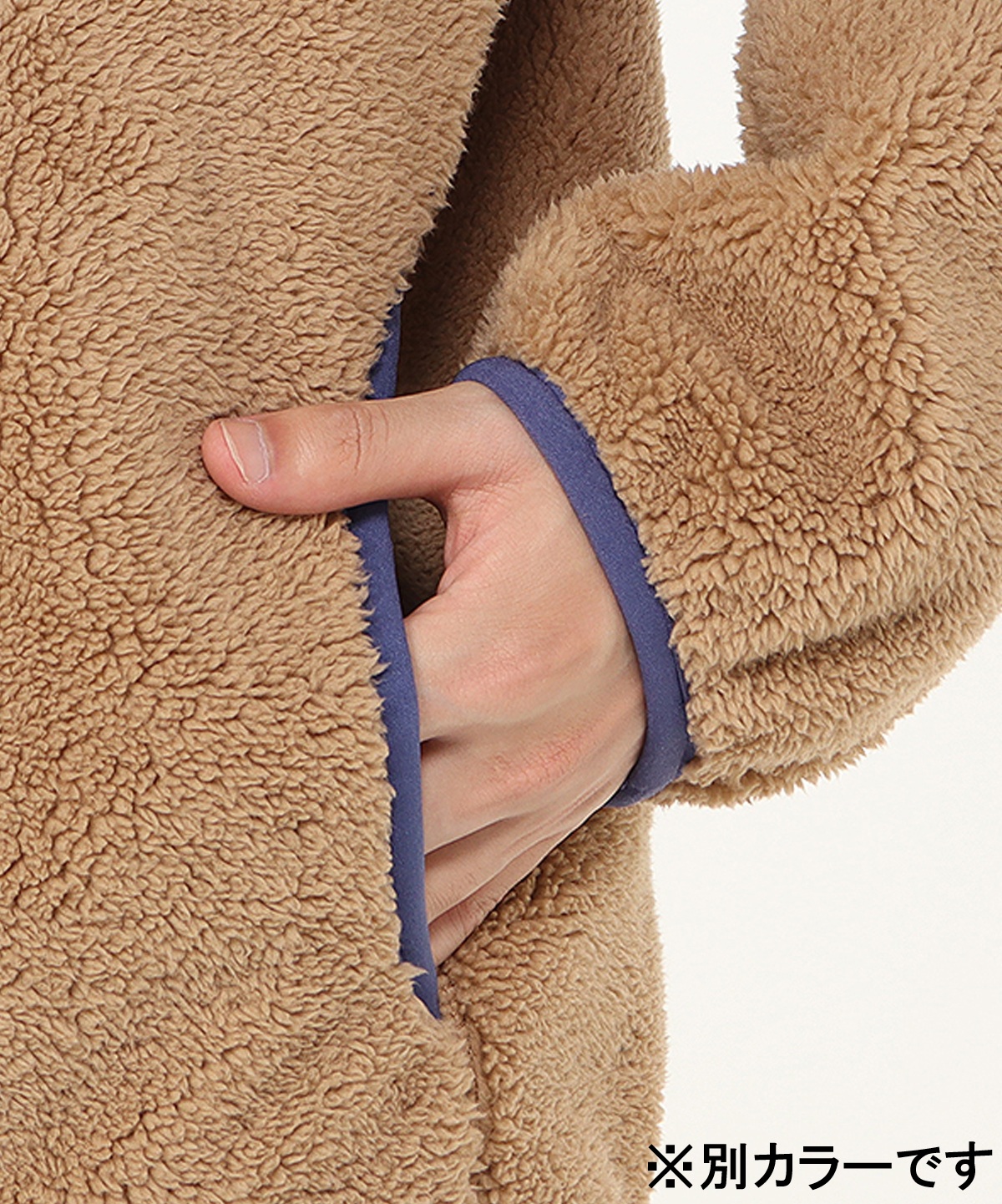 表地には肉厚なボアフリース、裏地にはソフトなマイクロフリースを使用。さらに、その間に防風フィルムを挟み込むことで、冷たい風を遮断しながら圧倒的な保温性を実現しました。まるで毛布に包まれているような安心感のある着心地で、一枚でもしっかりと暖かく過ごせます。
