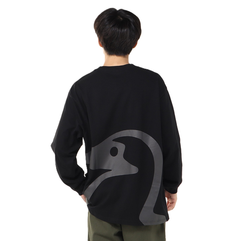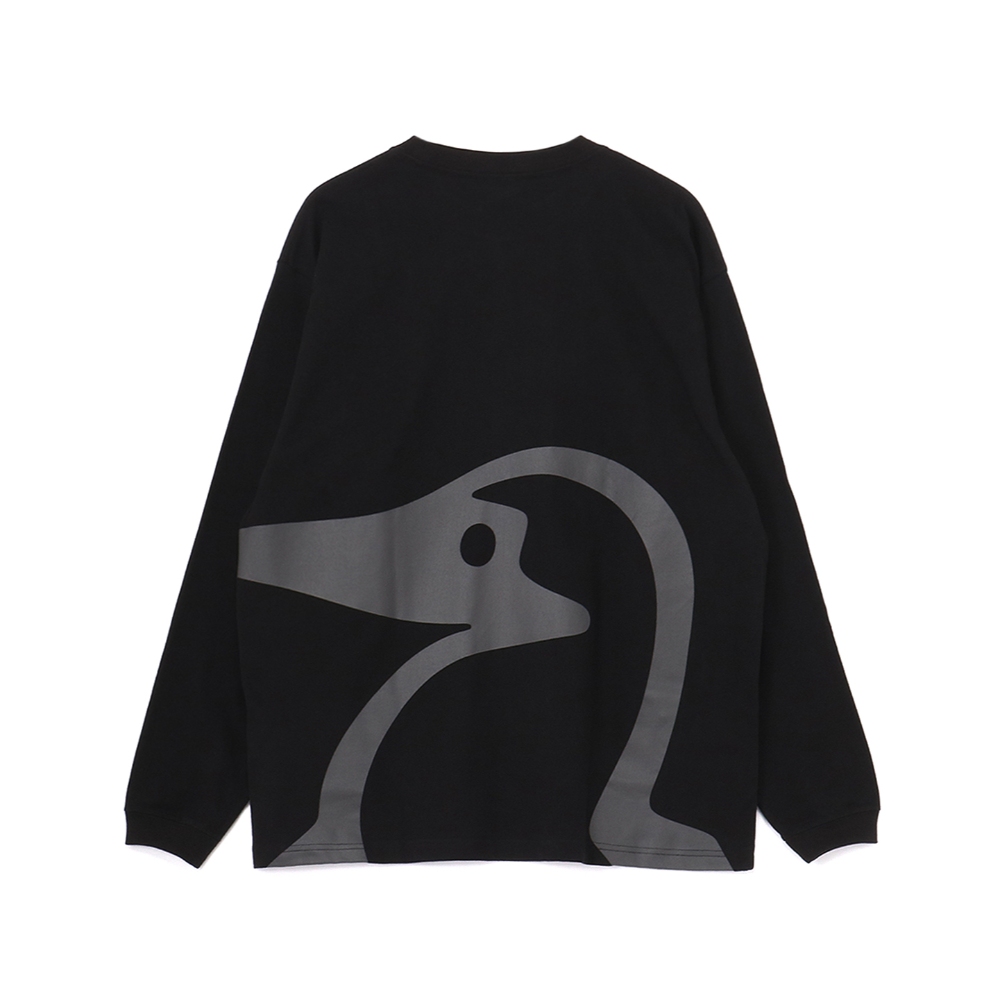 ゆったりとしたオーバーサイズシルエットのロングスリーブTシャツ。 前面と背面にはみ出すほど大きなブービーバードをプリント。実際に着用するとブービーバードから足が生えているように見える、視覚的なあそびゴコロのある一枚。