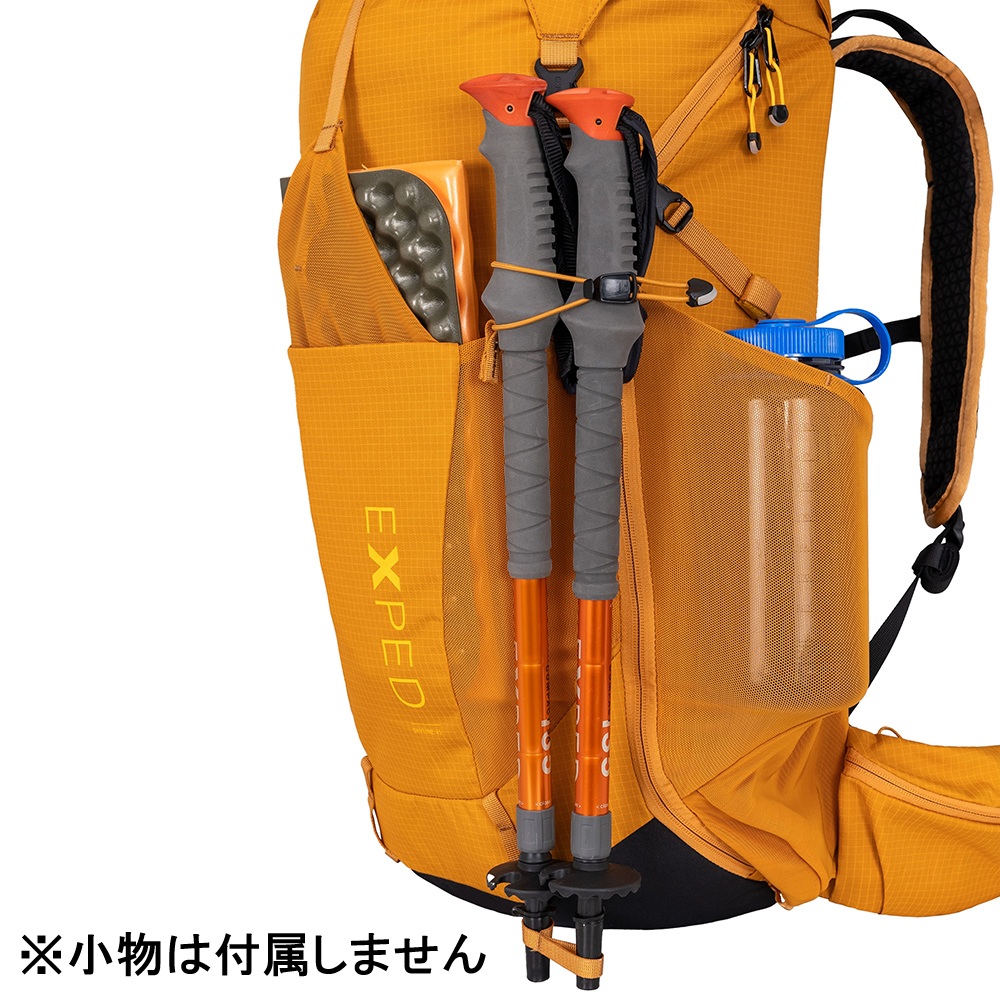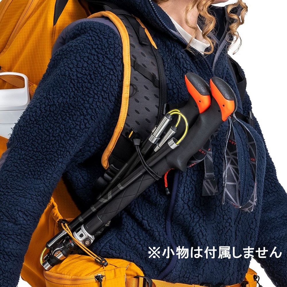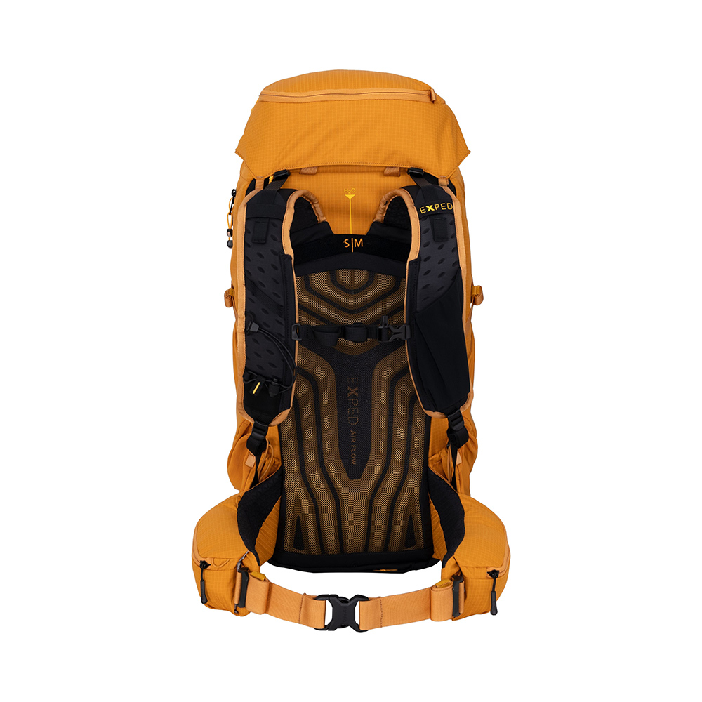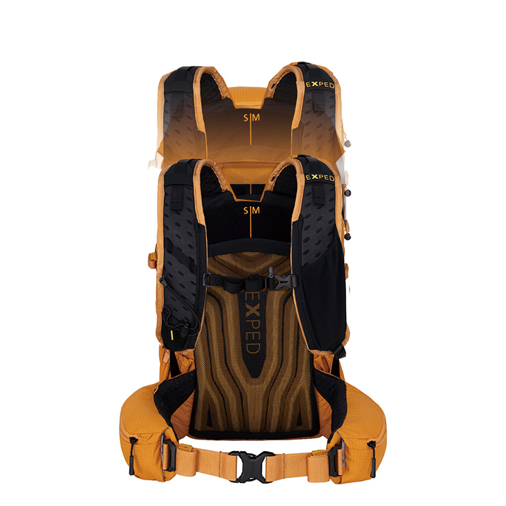 エアフローシステムは柔軟性があり、着用者の背中が自然に動くようになっています30Lと45Lのモデルには、より重い荷物を運ぶ想定で軽量スチールフレームが入っていて、背面長の長さが調節可能になっている。