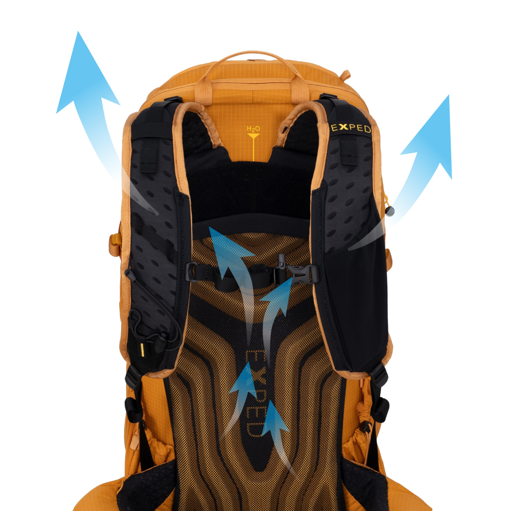 エアフローシステムは柔軟性があり、着用者の背中が自然に動くようになっています30Lと45Lのモデルには、より重い荷物を運ぶ想定で軽量スチールフレームが入っていて、背面長の長さが調節可能になっている。