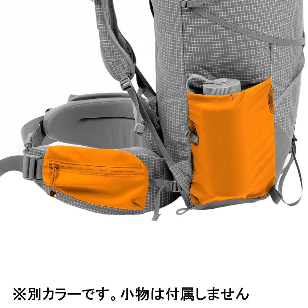 両サイドにあるストレッチメッシュポケットには、水筒やトレッキングポールが収納でき、ヒップベルトにあるジッパー式ストレッチポケットには、行動食や携帯電話などの小物を収納できます。上部の耐水ジッパー付きポケットは、貴重品を収納するのに便利です。