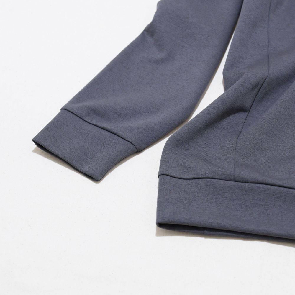 素材に、ポリエステルを使用したスウェット生地を採用し、高い速乾性とストレッチ性を備えています。ほどよい肉厚感の生地で、冬から春などの寒暖差が安定していない季節の変わり目に活躍します。