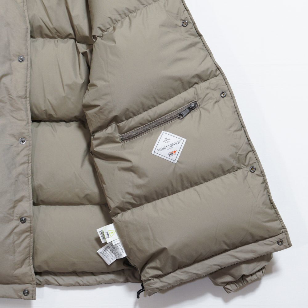 表地にははっ水加工を施した、軽くナチュラルな風合いのリサイクルタスランナイロンを使用。マットな質感の生地に、パッカリングを効かせてスポーティ感を抑え、都市生活に馴染むデザイン感です。中わたの一部にリサイクルダウンを使用し、保温性と軽さを追求。裏地にGORE-TEX WINDSTOPPER 2層構造を使用し、風の侵入を軽減しています。