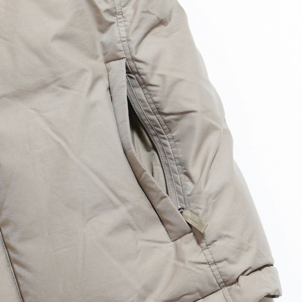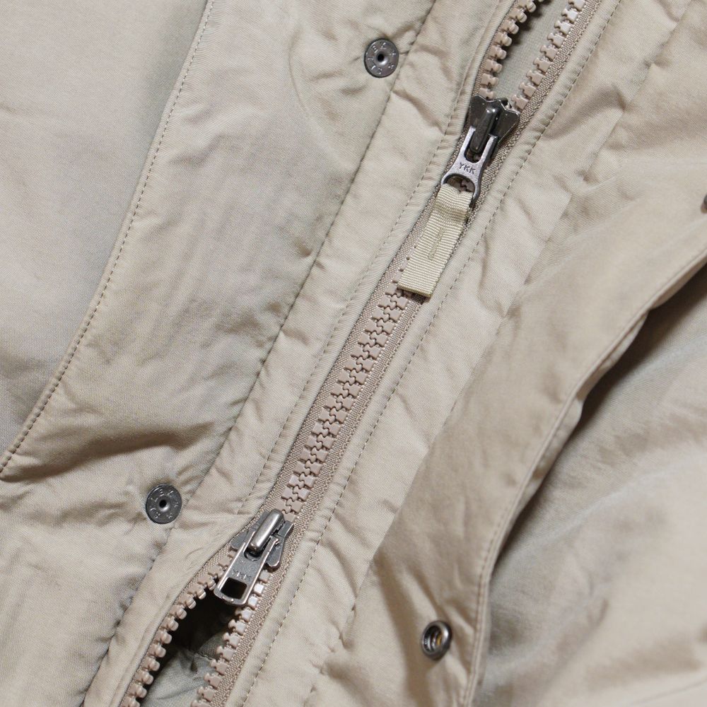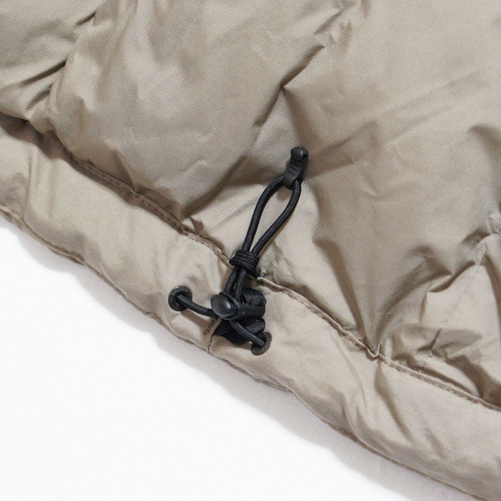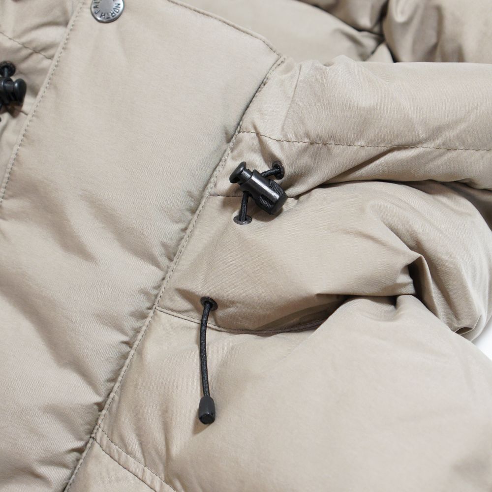 表地にははっ水加工を施した、軽くナチュラルな風合いのリサイクルタスランナイロンを使用。マットな質感の生地に、パッカリングを効かせてスポーティ感を抑え、都市生活に馴染むデザイン感です。中わたの一部にリサイクルダウンを使用し、バッフル感と軽さを追求。裏地にGORE-TEX WINDSTOPPER 2層構造を使用し、風の侵入を軽減しています。フロントはダブルフラップ仕様。ダウンをたっぷりと封入したフードは頭部をしっかり覆うことができる大きめの設計で、ドローコードで調節が可能です。