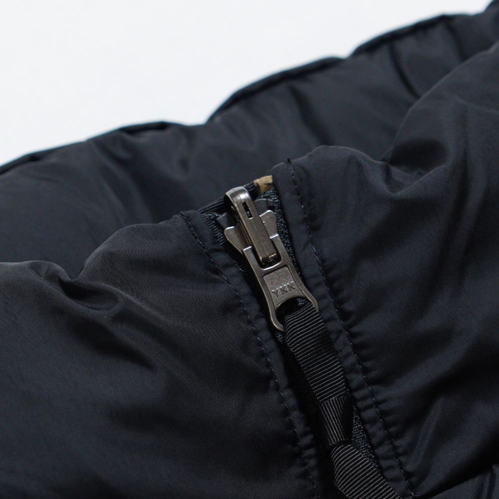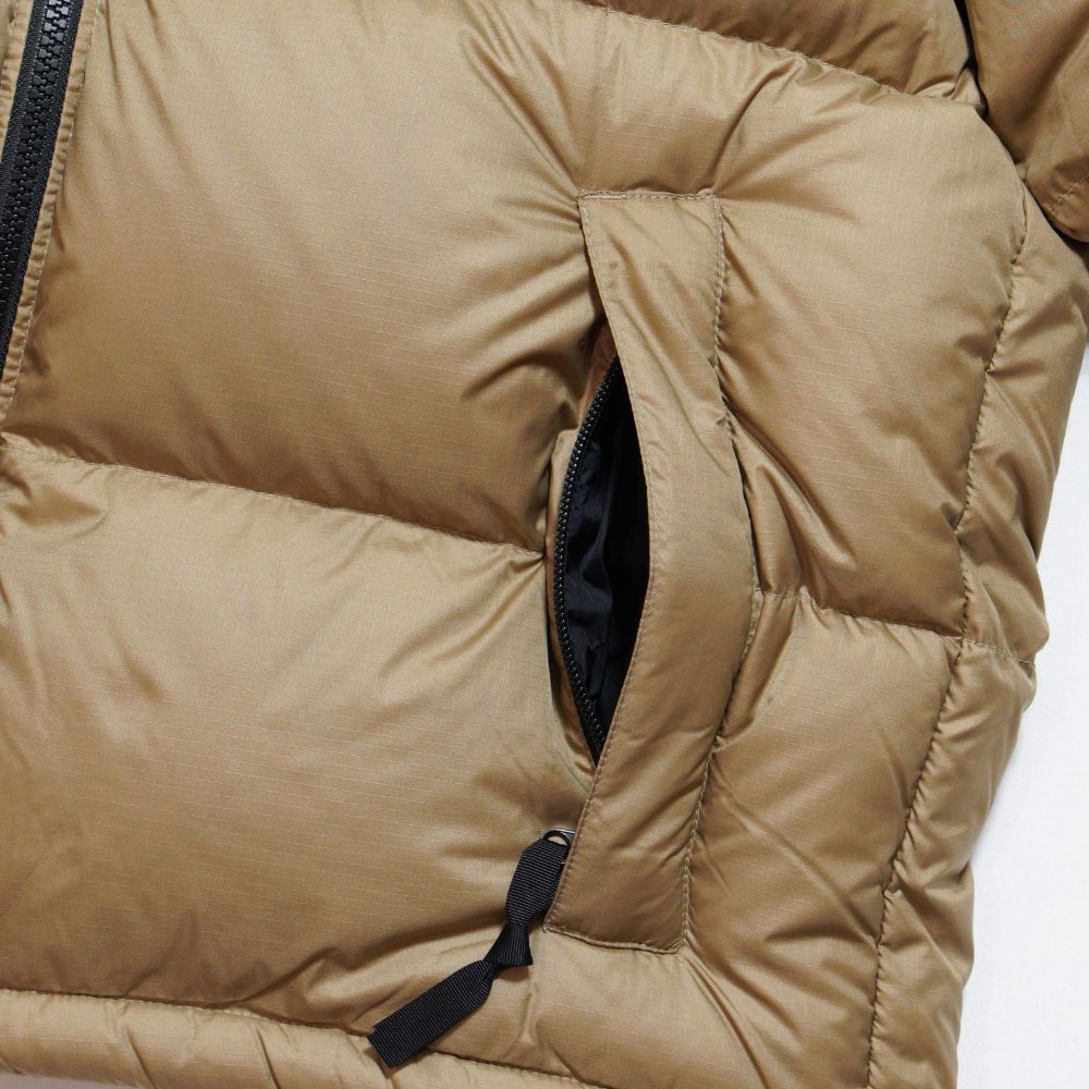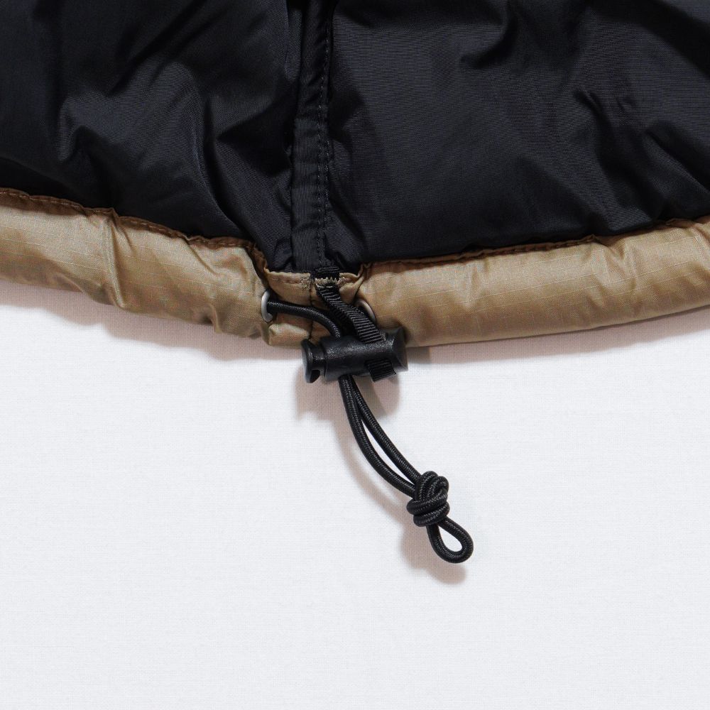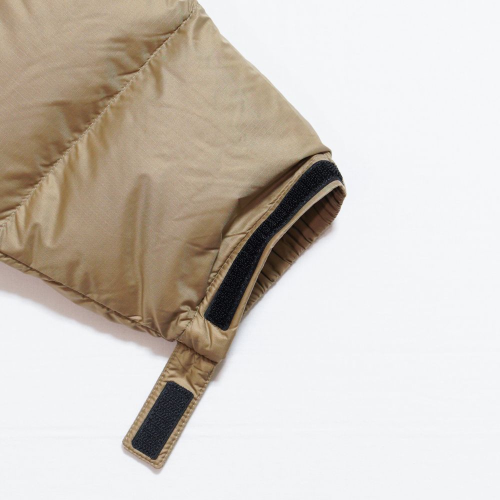 環境に配慮したリサイクルダウンを中わたの一部に使用。表地は強度がある40デニールのリップストップナイロンにはっ水加工を施し、パックに干渉する肩部分は厚手のナイロン素材に切り替えています。