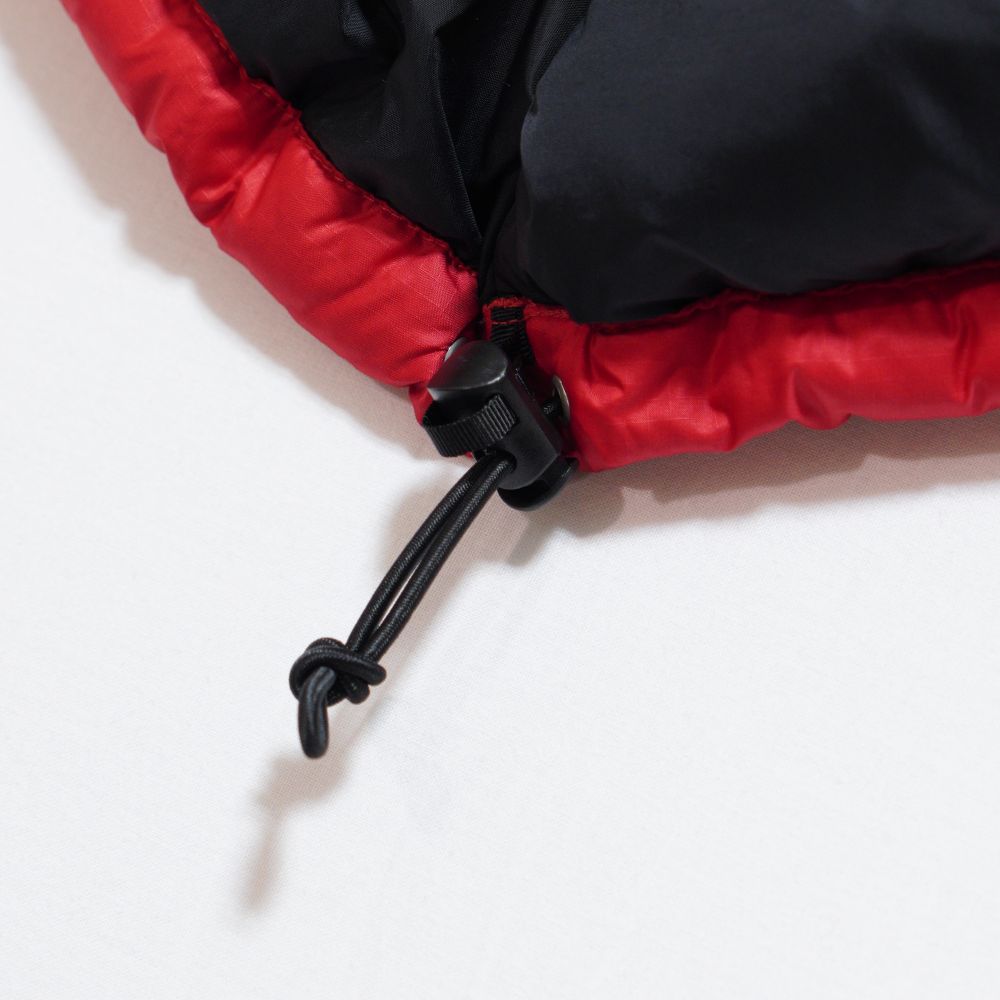 環境に配慮したリサイクルダウンを中わたの一部に使用。表地は強度がある40デニールのリップストップナイロンにはっ水加工を施し、肩切り替え部分は厚手のナイロン素材に切り替えています。