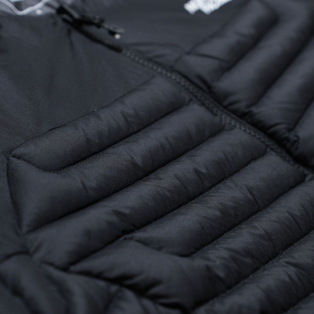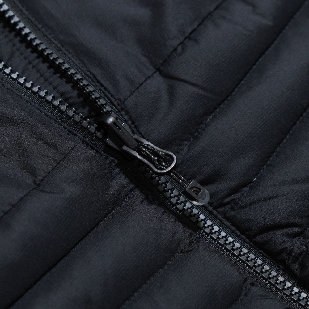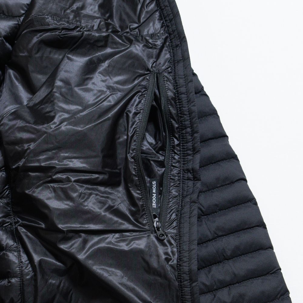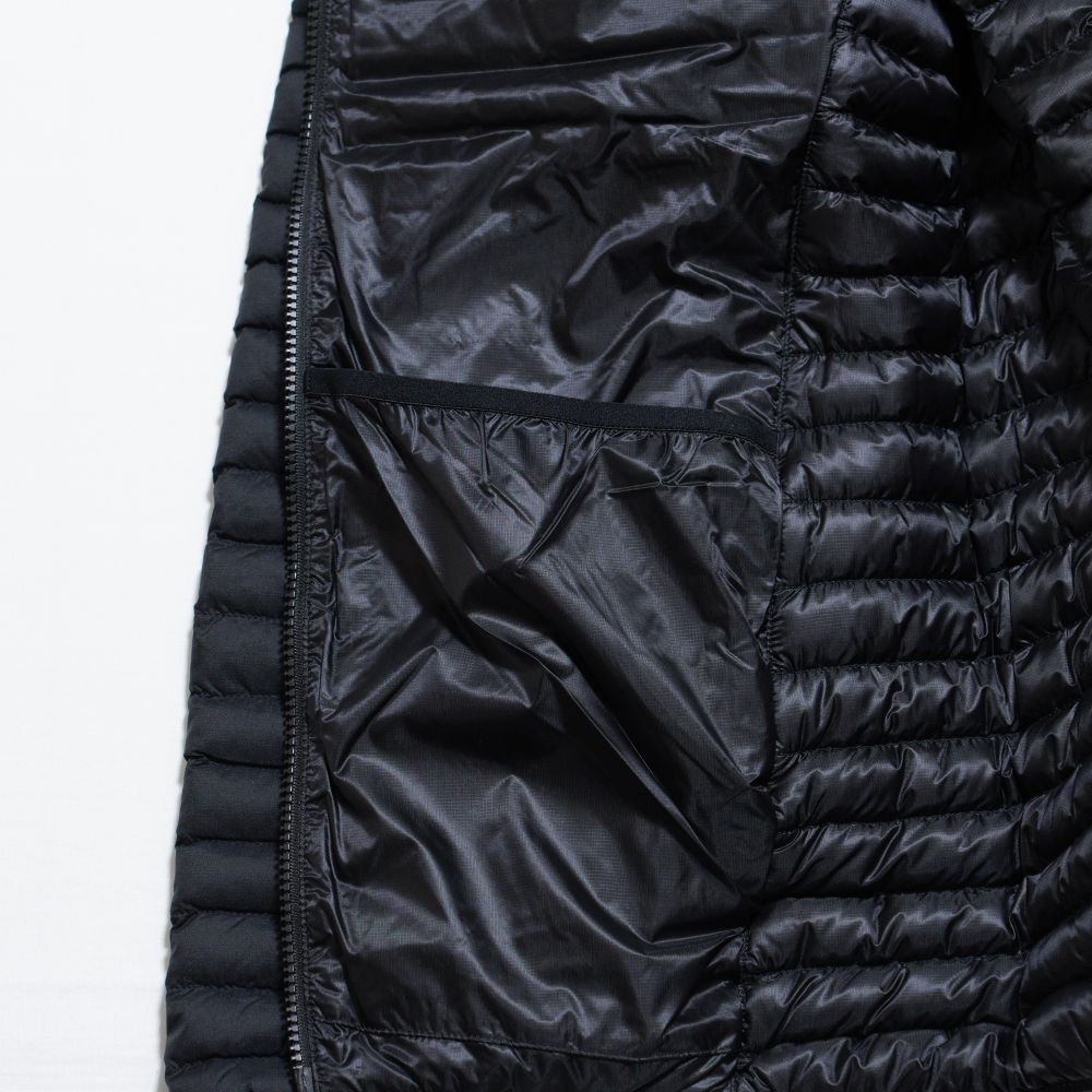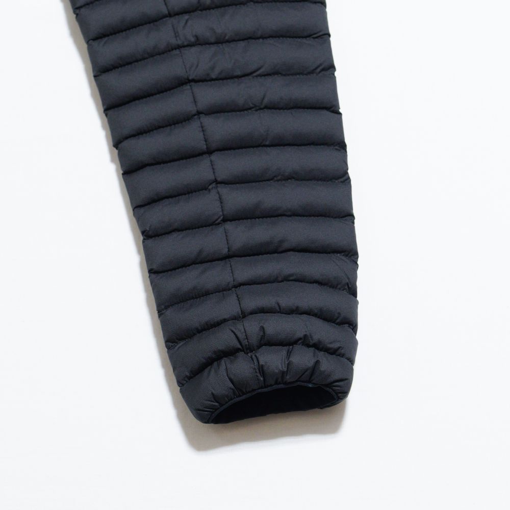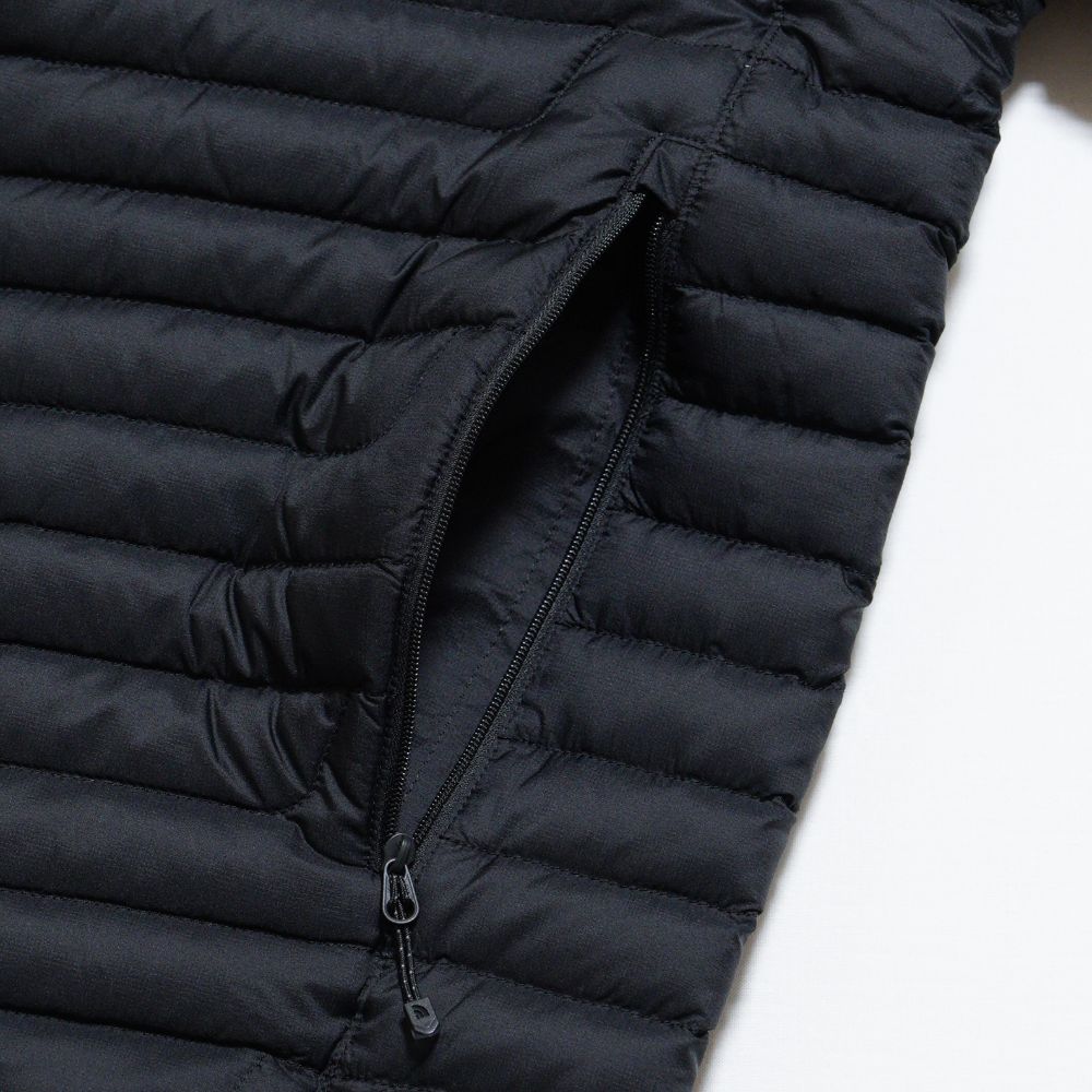身頃には、高度な洗浄技術により汚れを徹底的に除去し、さらにはっ水加工を施したクリーンなダウンを使用。パックでつぶれやすい肩部分には板状の化繊わたを配置。生地にはソフトな肌触りで軽く、強度も兼ね備えるパーテックスカンタムを使用。 専用ファスナーでアウターシェルと連結できる、ZIP IN ZIPシステム対応。