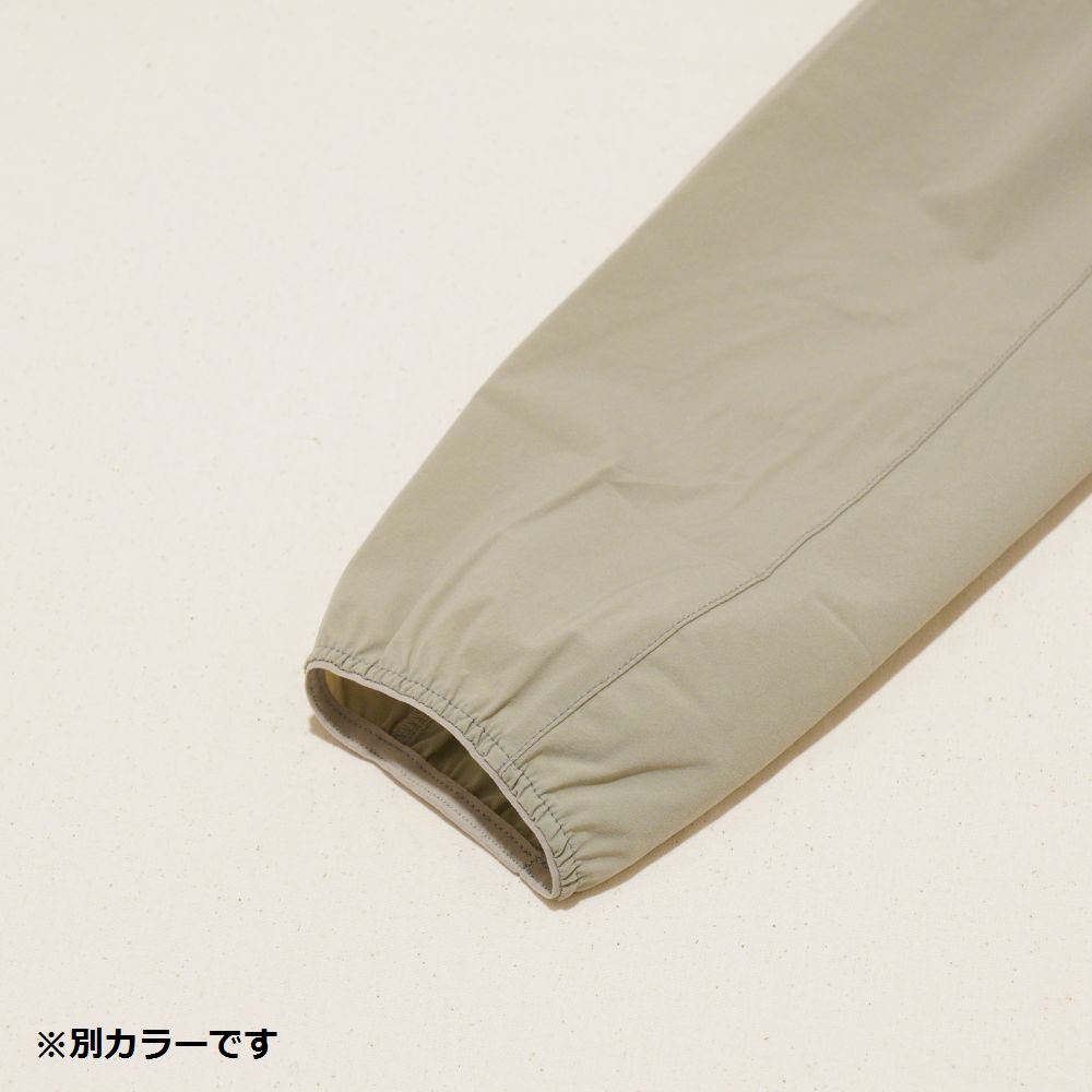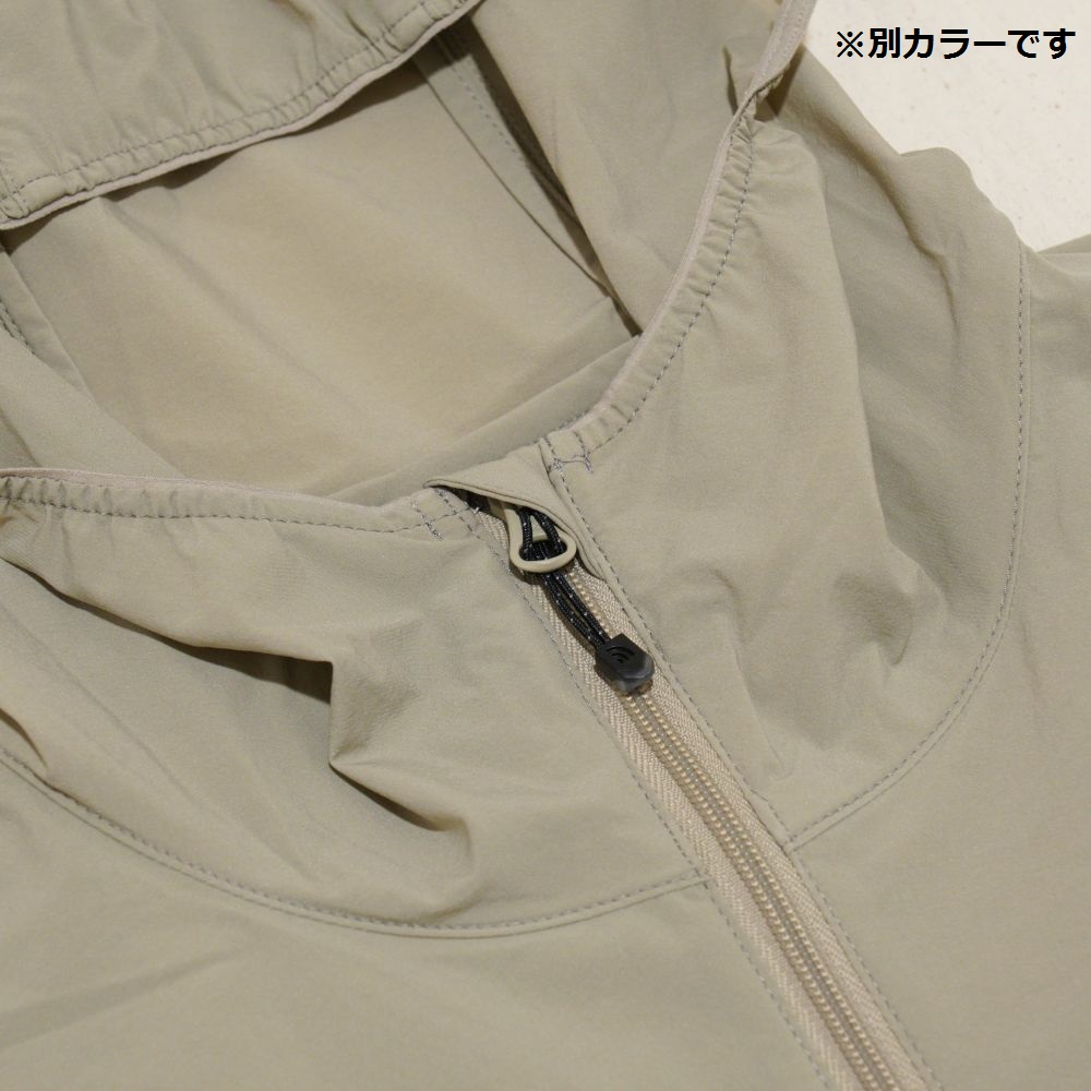 はっ水加工を施し、多少の雨に対応。フードや袖口、裾はシンプルなバインダー仕様。フィット性の高いフードは、顔周りの視界を妨げにくい構造です。