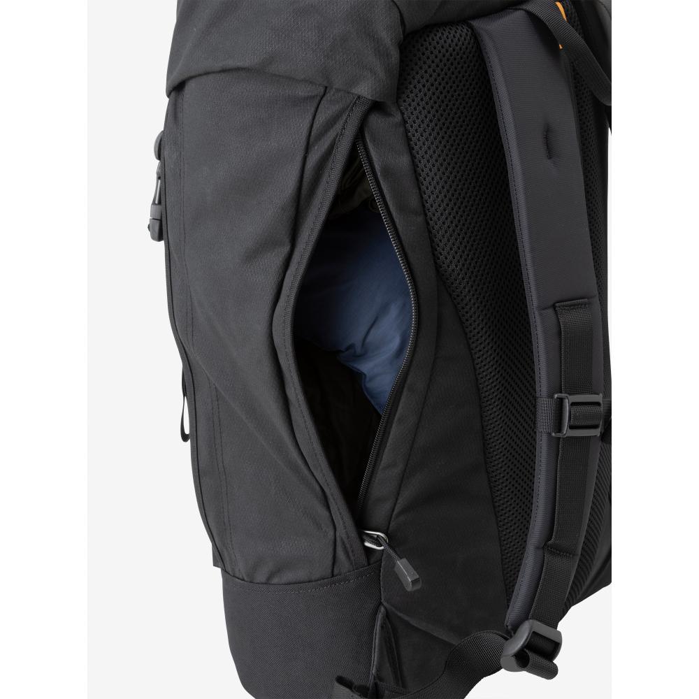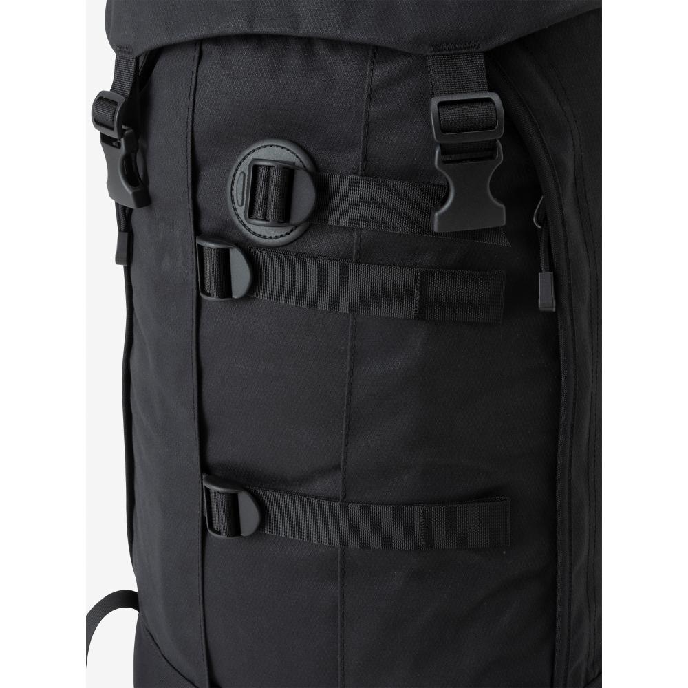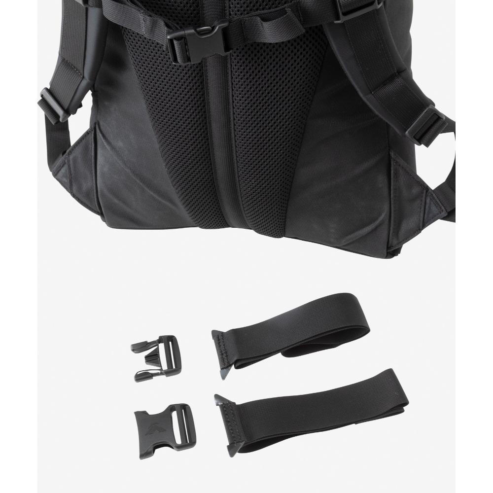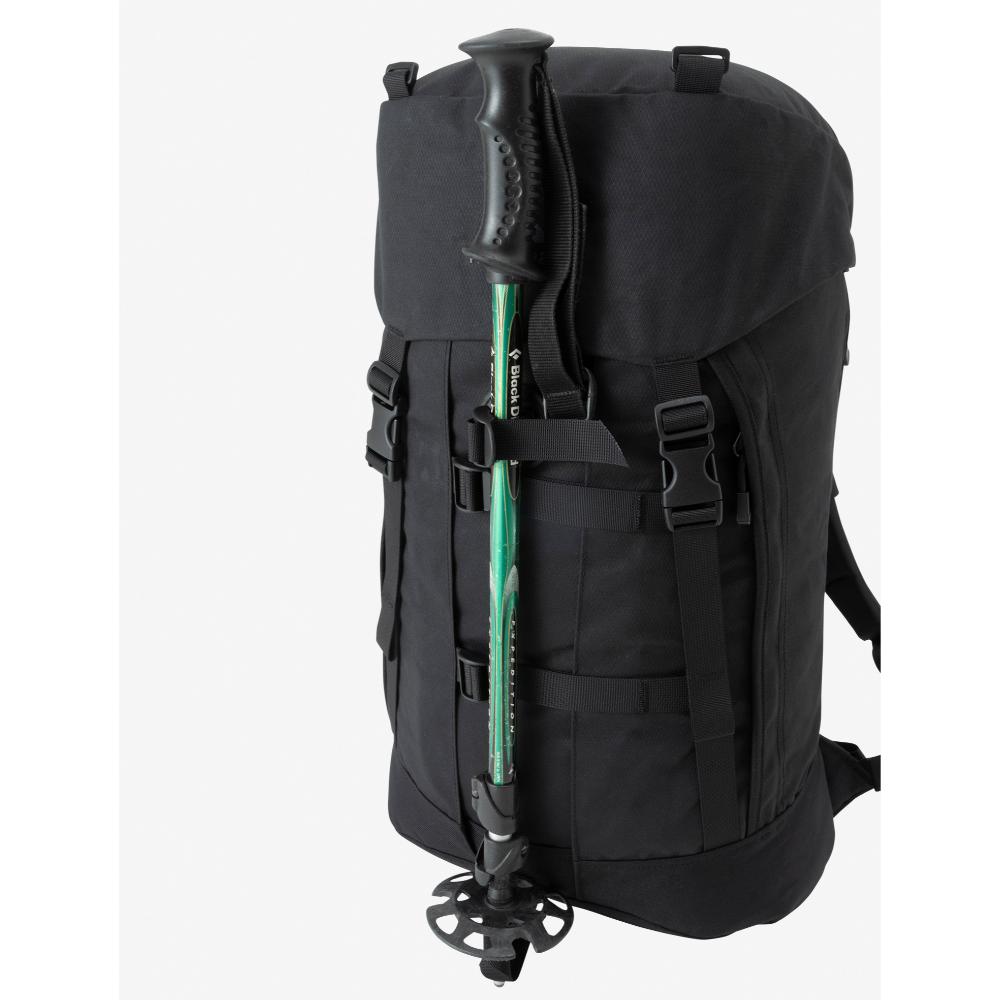 メインファブリックには、耐久性と耐水性に優れた「AzTec 8oz canvas」を使用。メインコンパートメントはシンプルな1気室で、操作性が高いトップローディング式を採用しています。大容量の雨蓋ポケットは利便性が高く、雨蓋を操作せずにメインコンパートメントへのアクセスを可能にする縦ジッパーを右サイドに配置しました。両サイドにはジッパーポケットを装備し、フロントにはポールなどを収納するストラップとポールループ付き。ウエストベルトは取り外しができます。