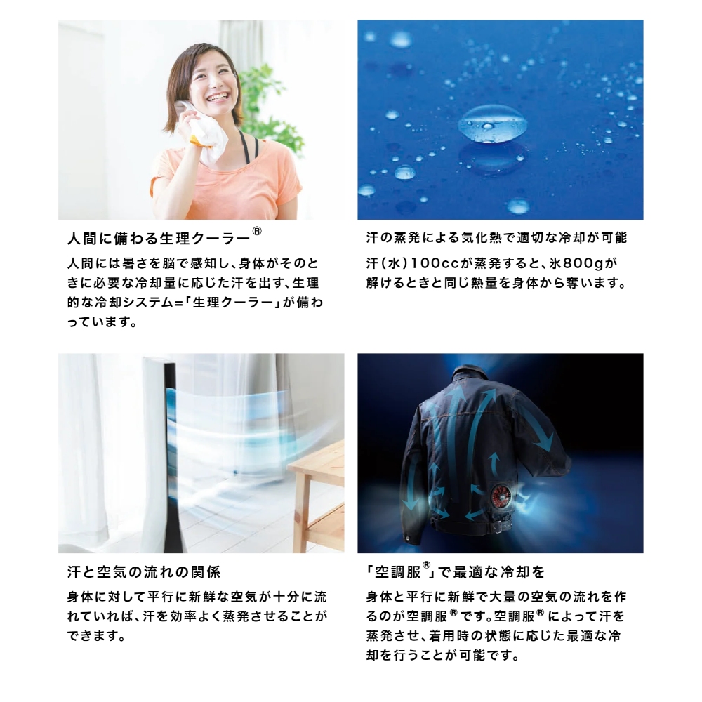 「空調服」、「DC空調服」ロゴ、「生理クーラー」は(株)セフト研究所・(株)空調服の登録商標です。