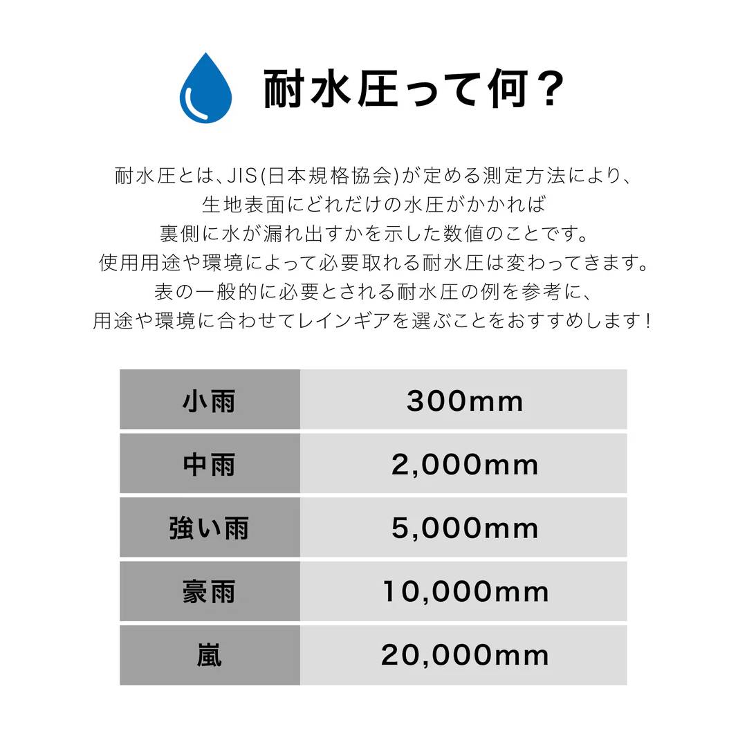 耐水圧とは、JIS(日本規格協会)が定める測定方法により、生地表面にどれだけの水圧がかかれば裏側に水が漏れ出すかを示した数値のことです。使用用途や環境によって必要取れる耐水圧は変わってきます。