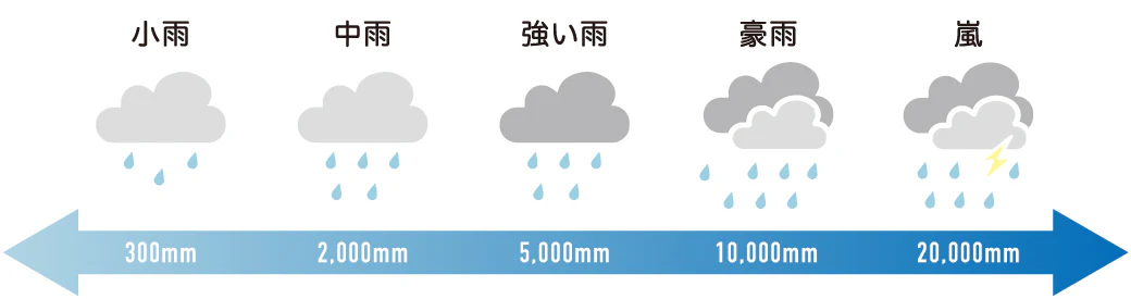 耐水圧とは、JIS(日本規格協会)が定める測定方法により、生地表面にどれだけの水圧がかかれば裏側に水が漏れ出すかを示した数値のことです。使用用途や環境によって必要取れる耐水圧は変わってきます。