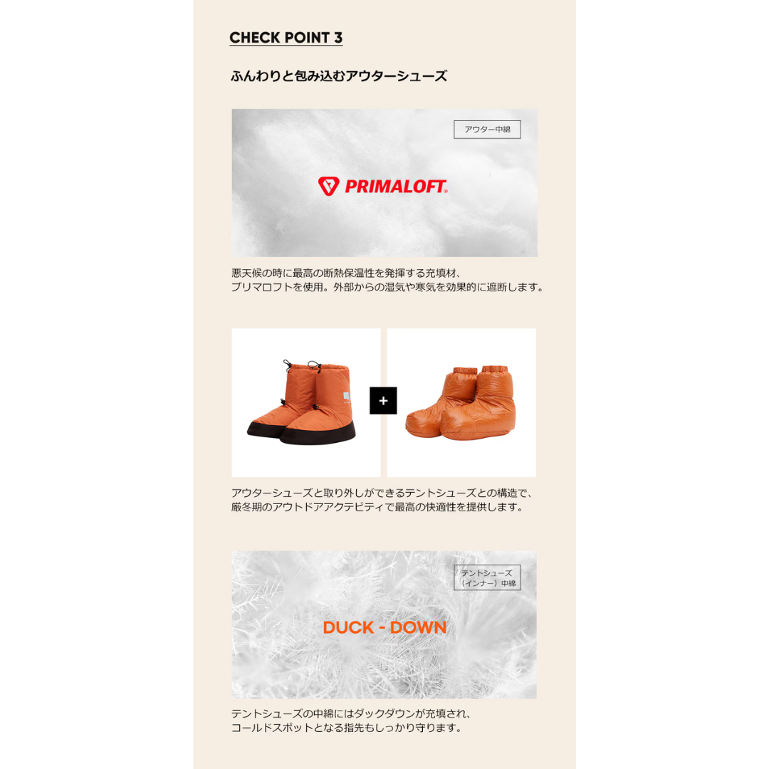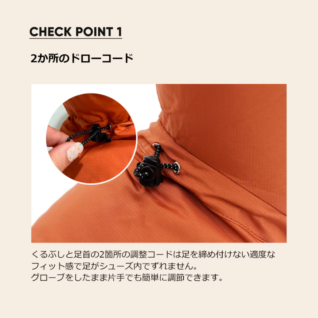 インナーには保温性が高く軽量でコンパクトに収納できるダウン素材を充填、足を入れた瞬間から暖かさを感じます。