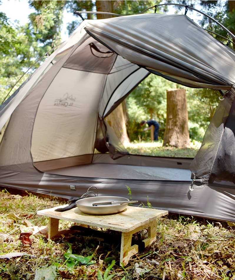 持ち運びしやすく、ミニマルキャンプのソロテーブルや、クーラーボックス等の台として丁度良いサイズです。