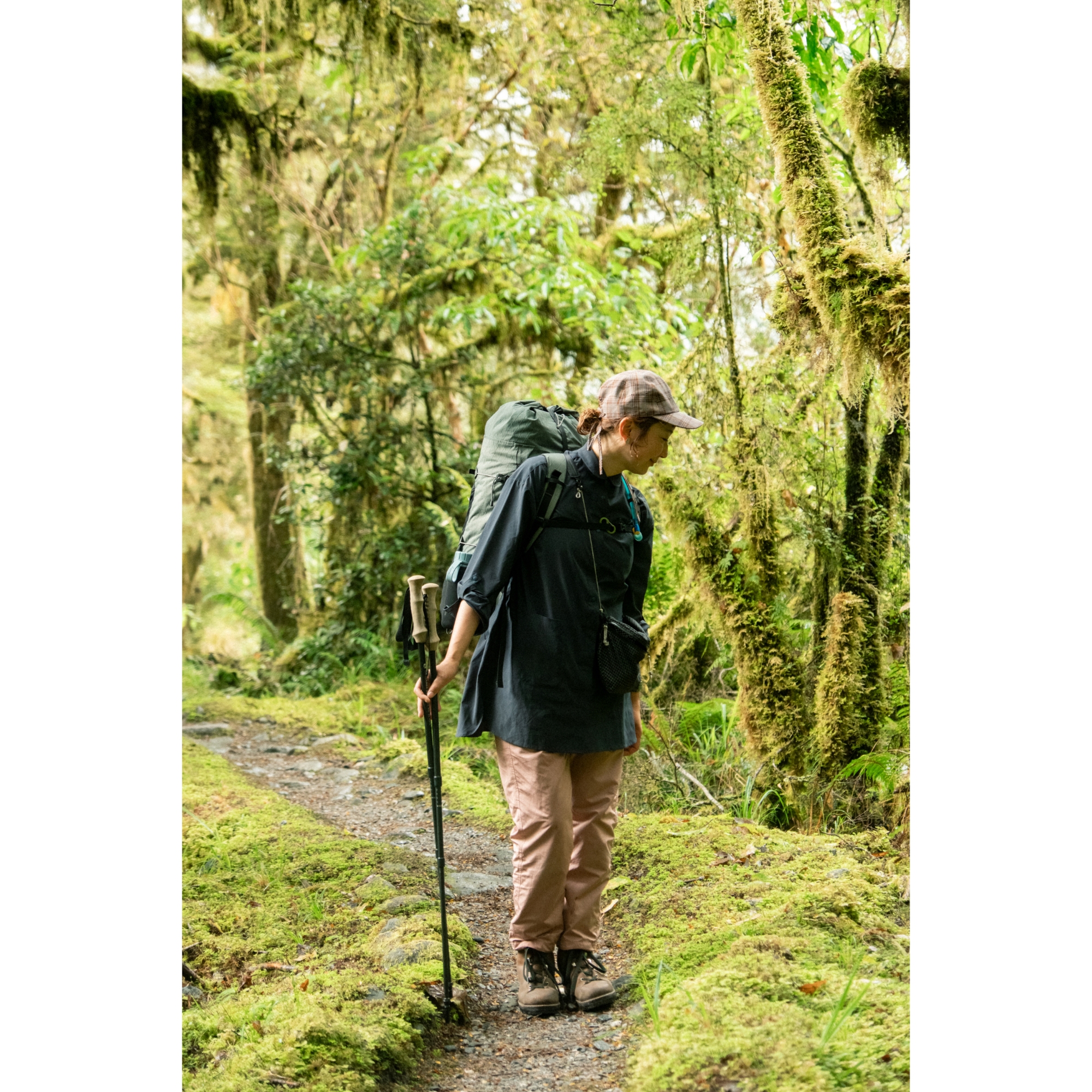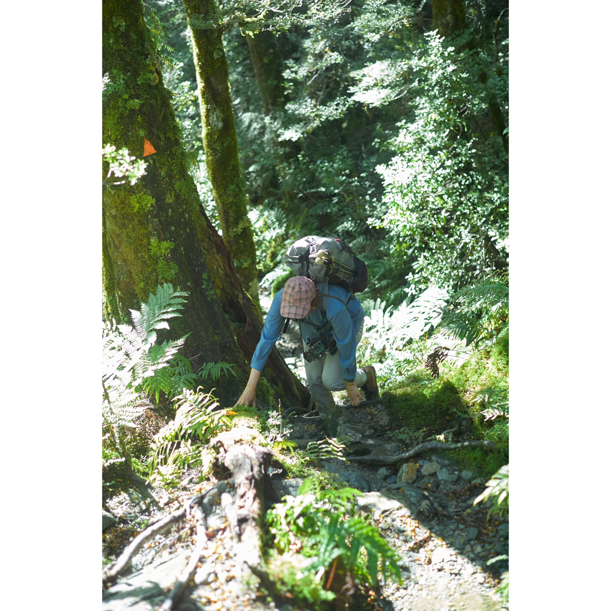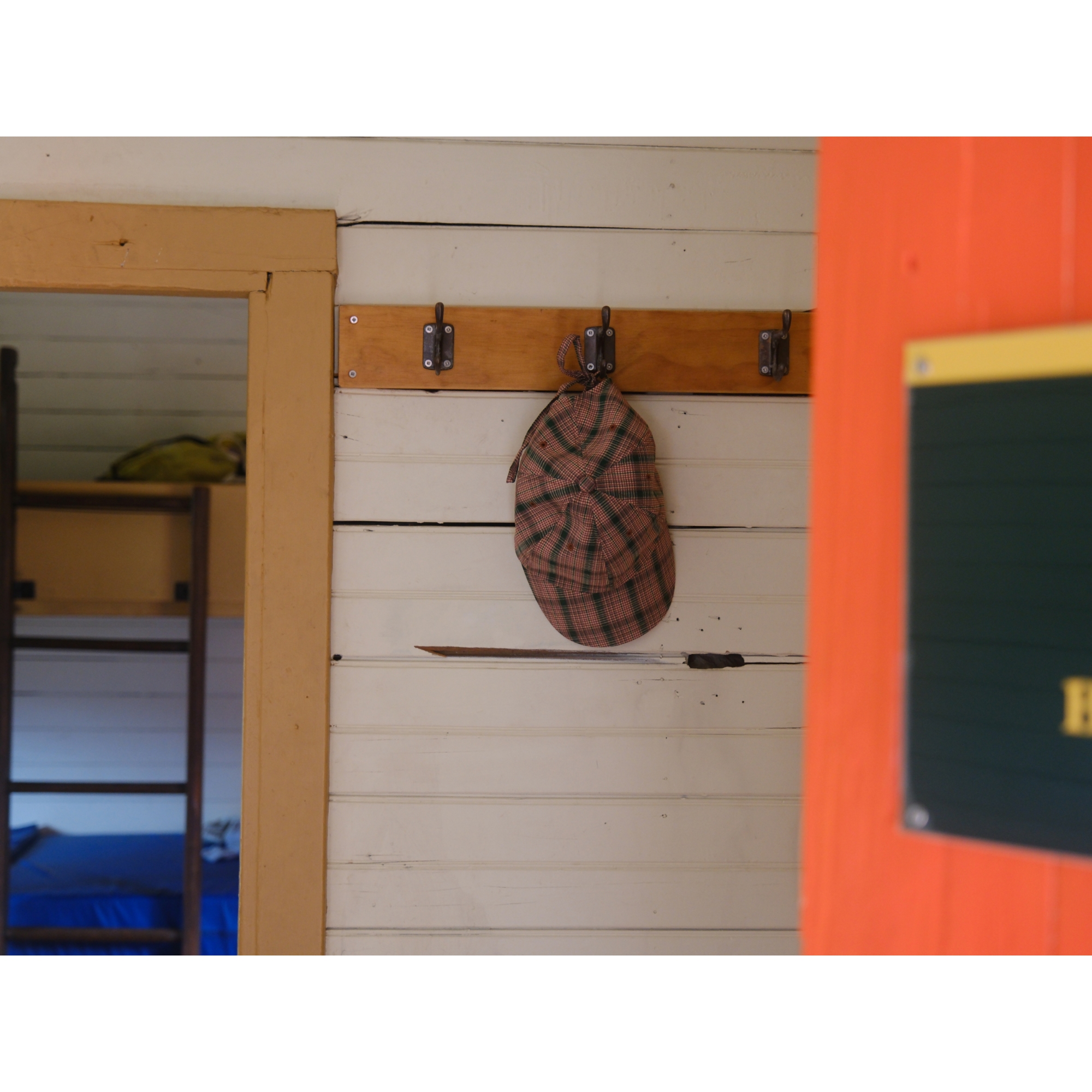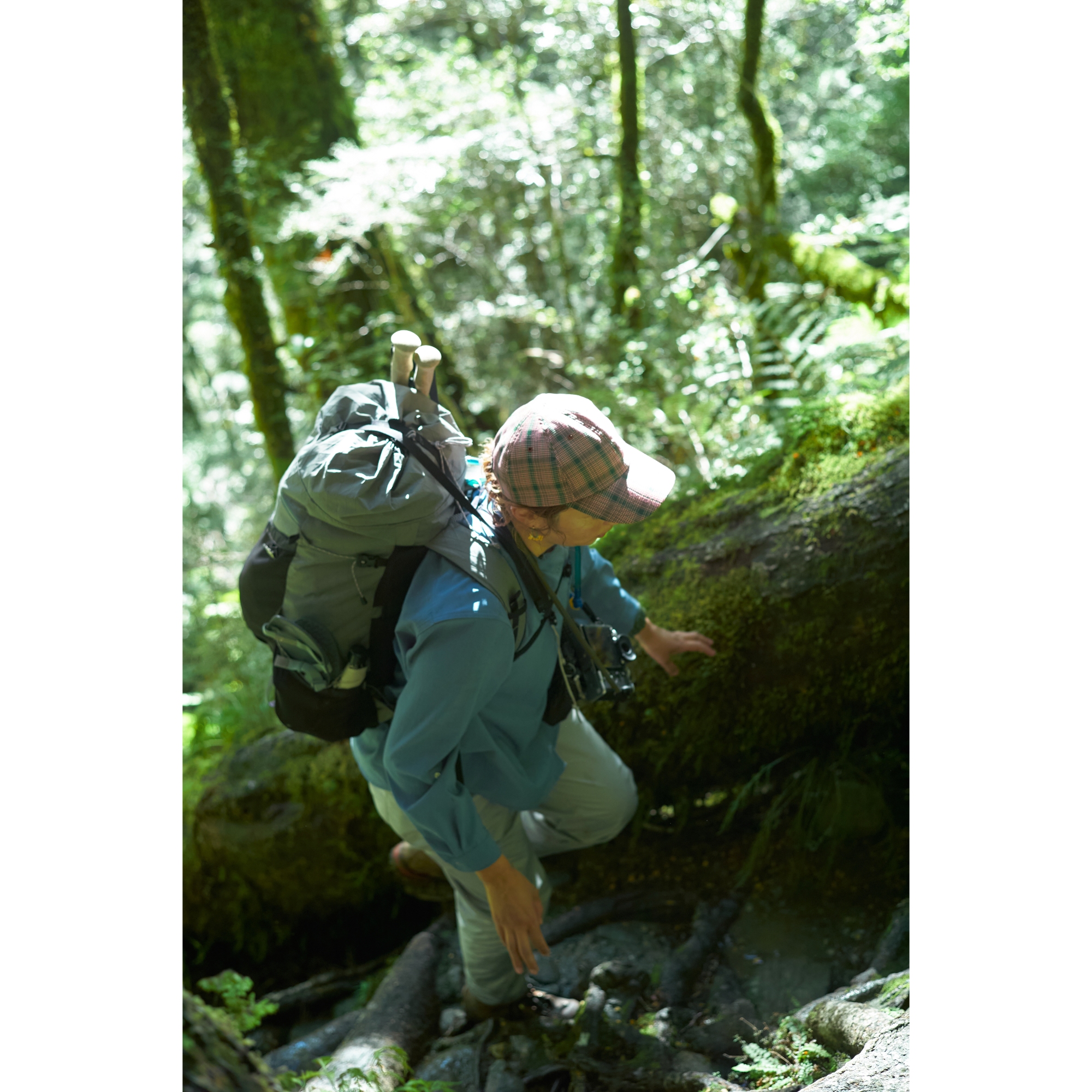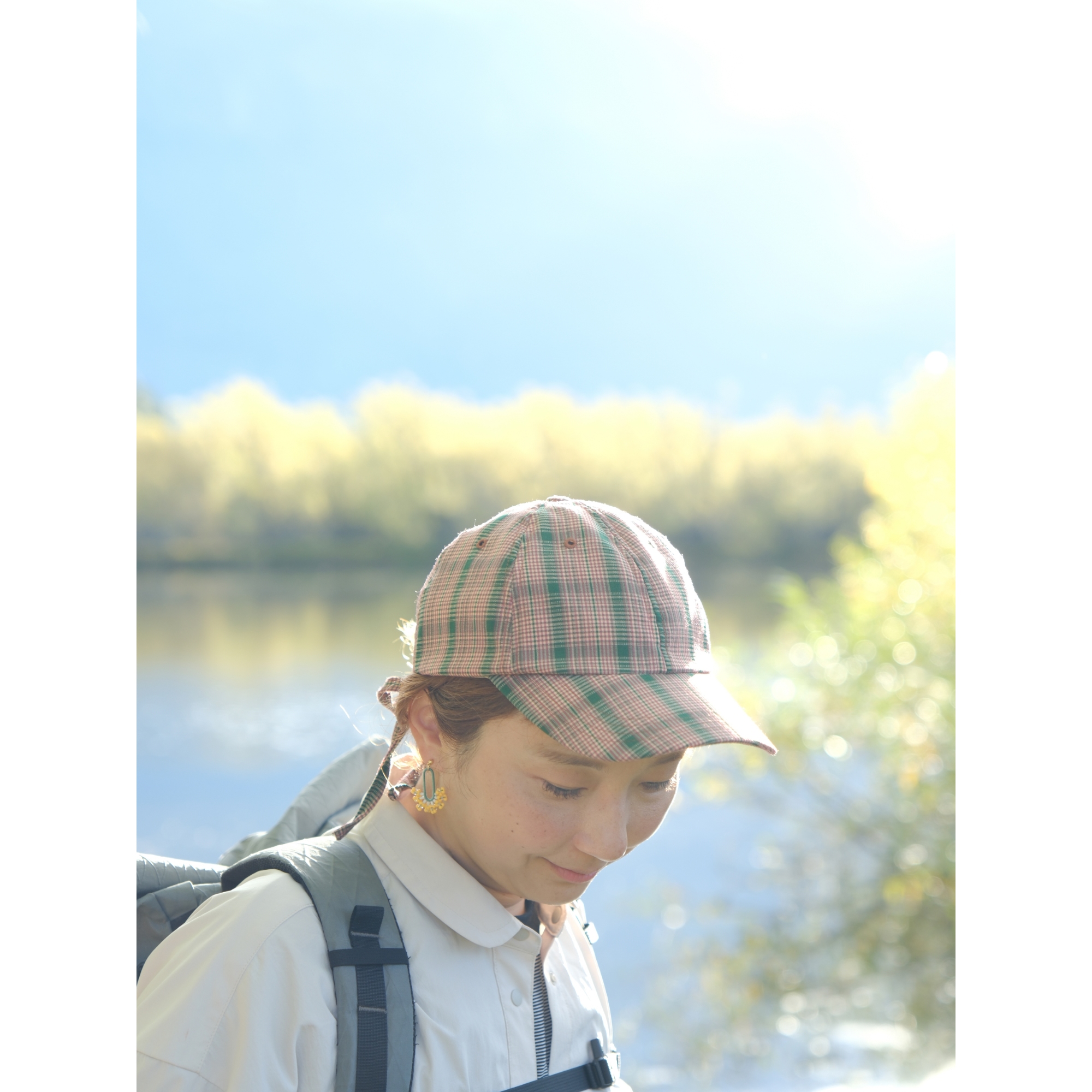 ベーシックなかたちに、チェック柄とリボンを施し、個性をもたせたハイキングキャップ。