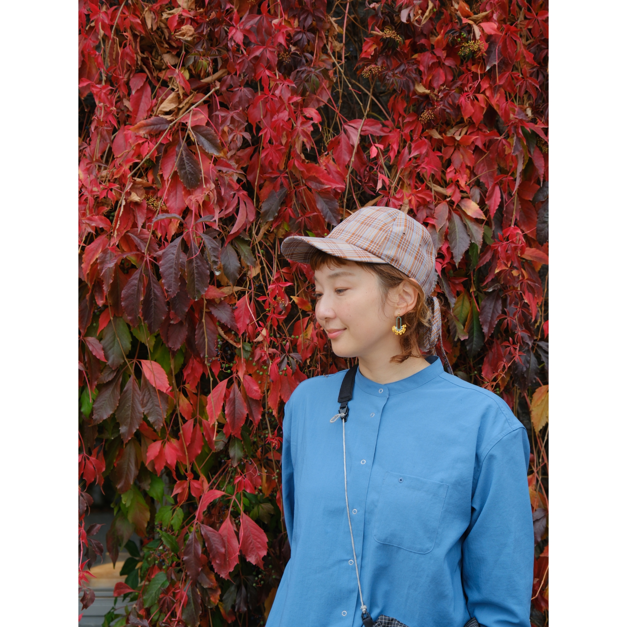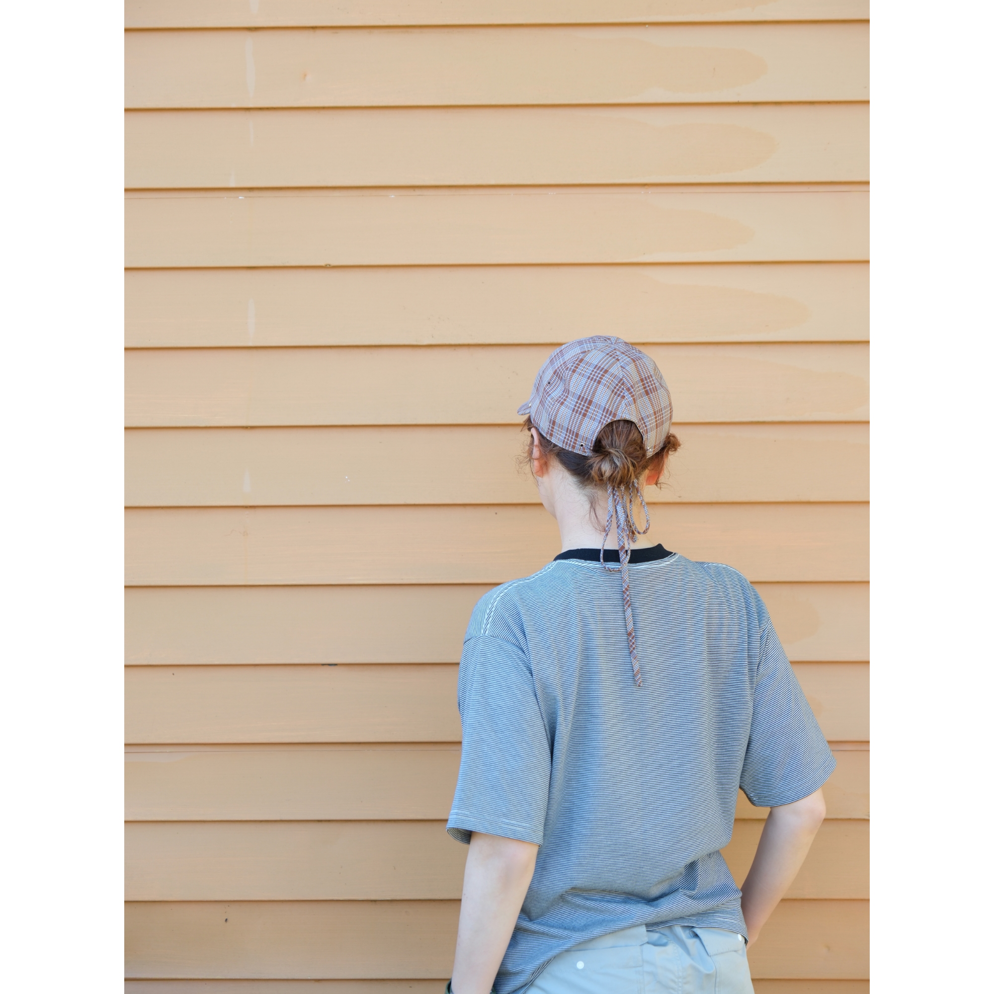 ベーシックなかたちに、チェック柄とリボンを施し、個性をもたせたハイキングキャップ。