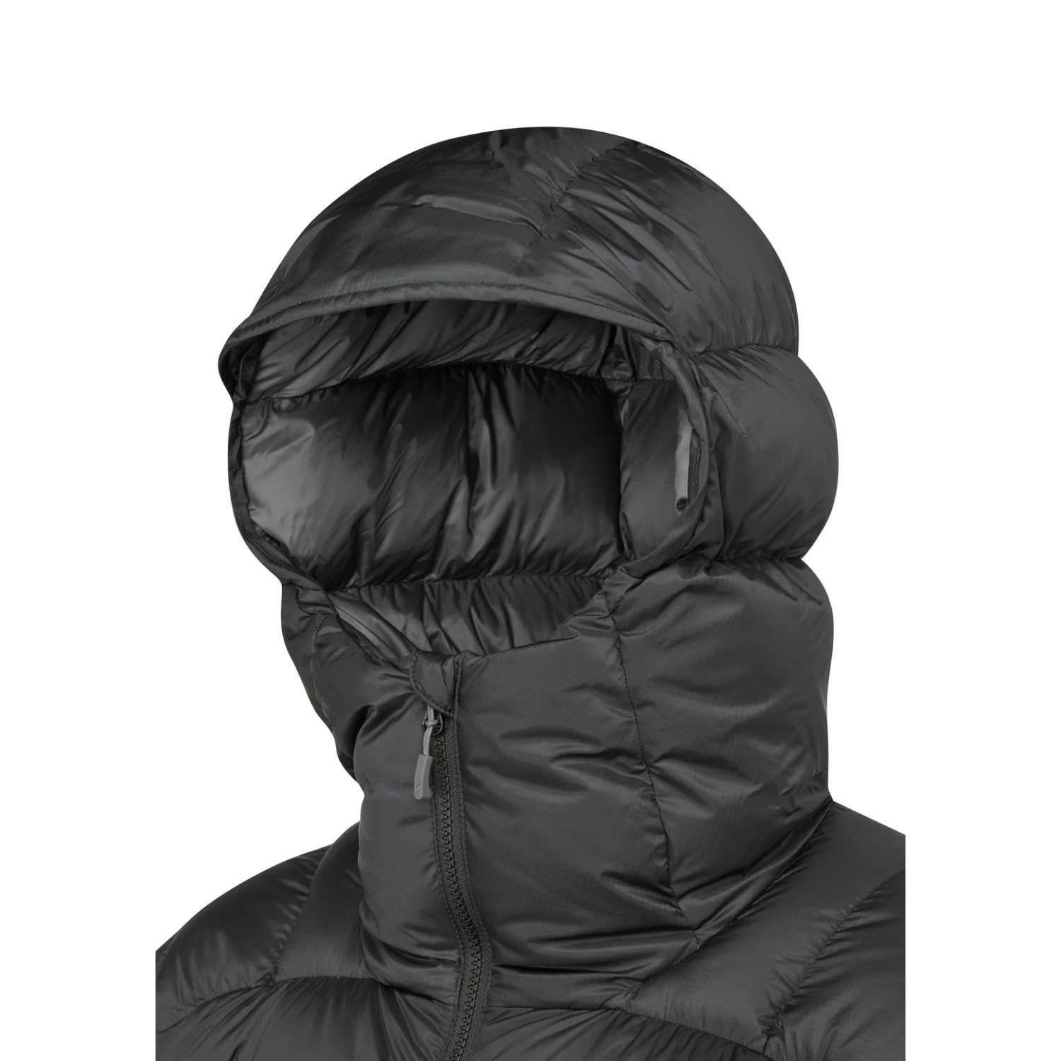 ・ヘルメット対応のダウン入りフードは不要時に巻き上げ可能。