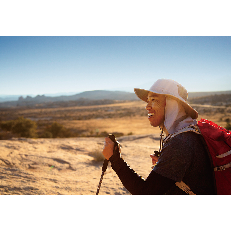 首元の日焼けを防ぐネックケープ付きモデル。ネックケープは本体に収納が可能です。