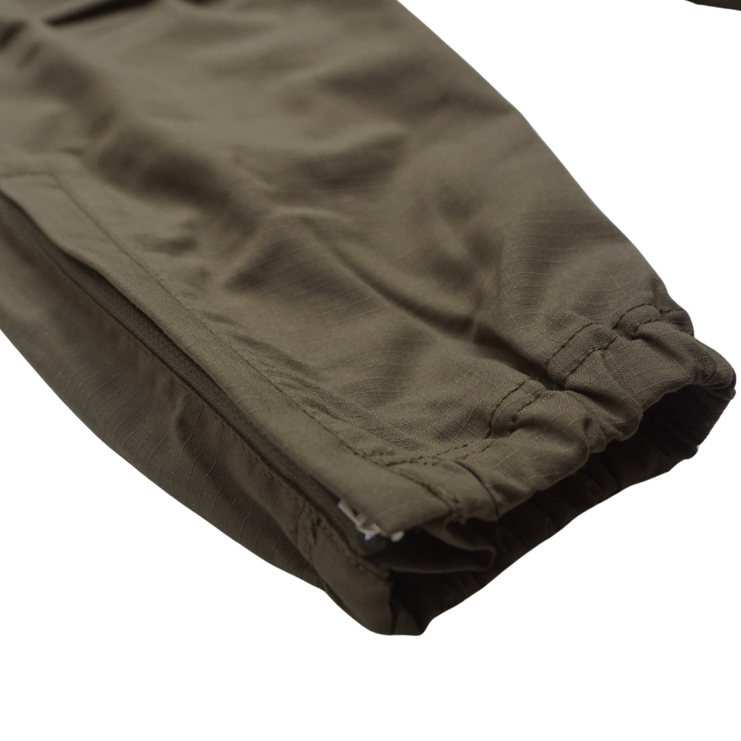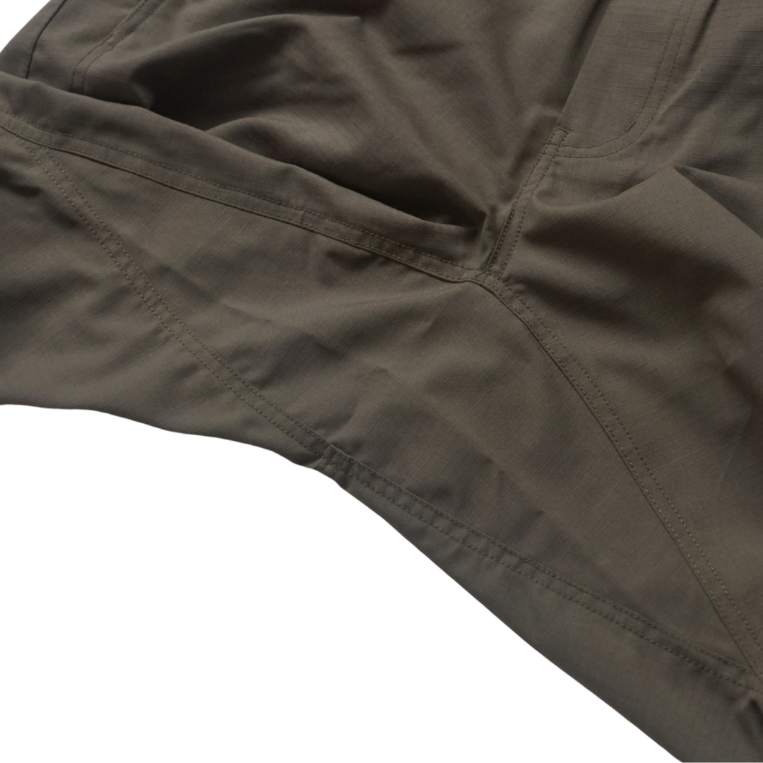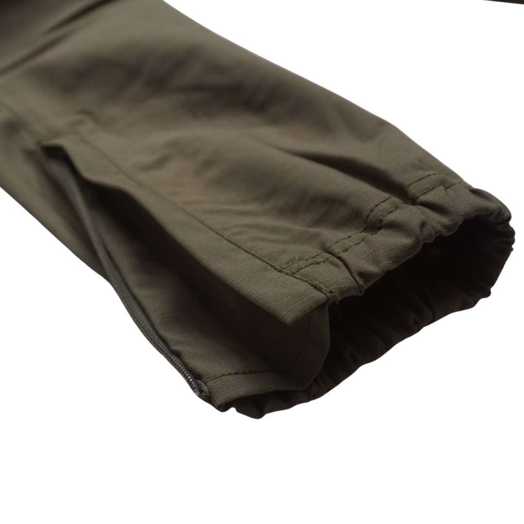 スリムでも簡単に脱ぎ着できるよう裾にはマチを付けてファスナーで開閉できるようにしました。 HIKEやBIKEの際に裾が汚れたりチェーンに巻き込まれないように平ゴムを入れてすっきりと着用できる設計にしています。股にガゼットクロッチをあしらうことでアクティブに活動しても生地がつっぱることなく足運びのよさをサポートしてくれます。