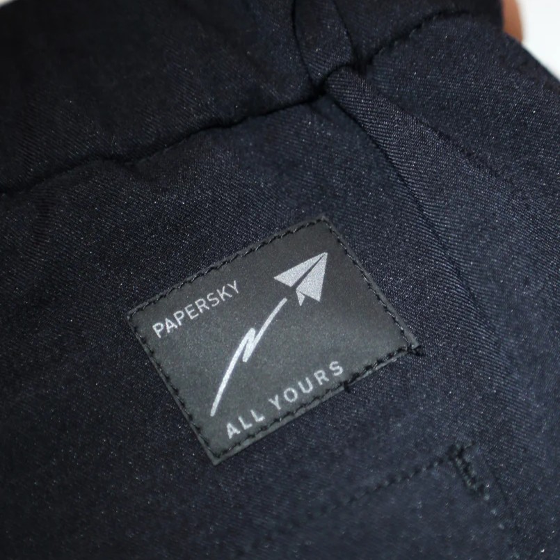 金属パーツを使用していないので、旅に出かける際の空港のALL YOURS と PAPERSKY がコラボしたブラックジーンズ。