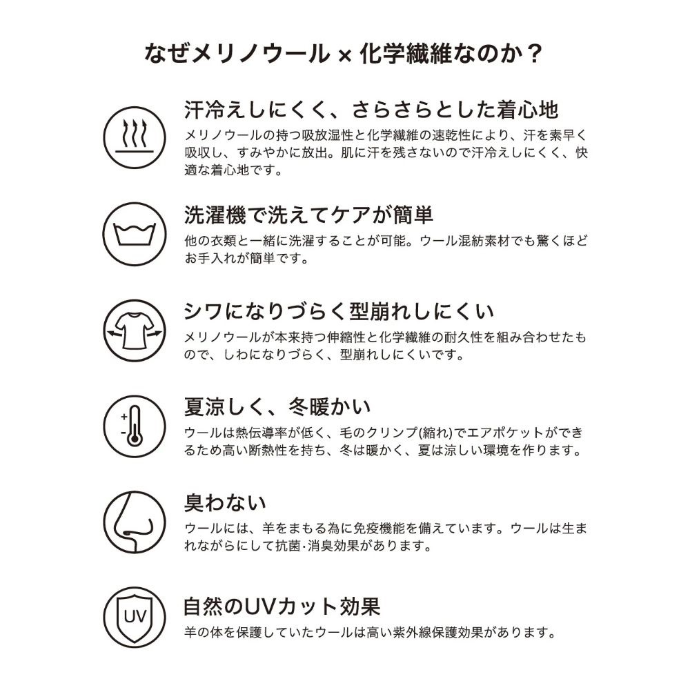 メリノウールのさらりとした風合いと吸湿効果、抗菌・防臭効果、UVカット効果に、更にポリエステルの優れた速乾性と耐久性も備えました。