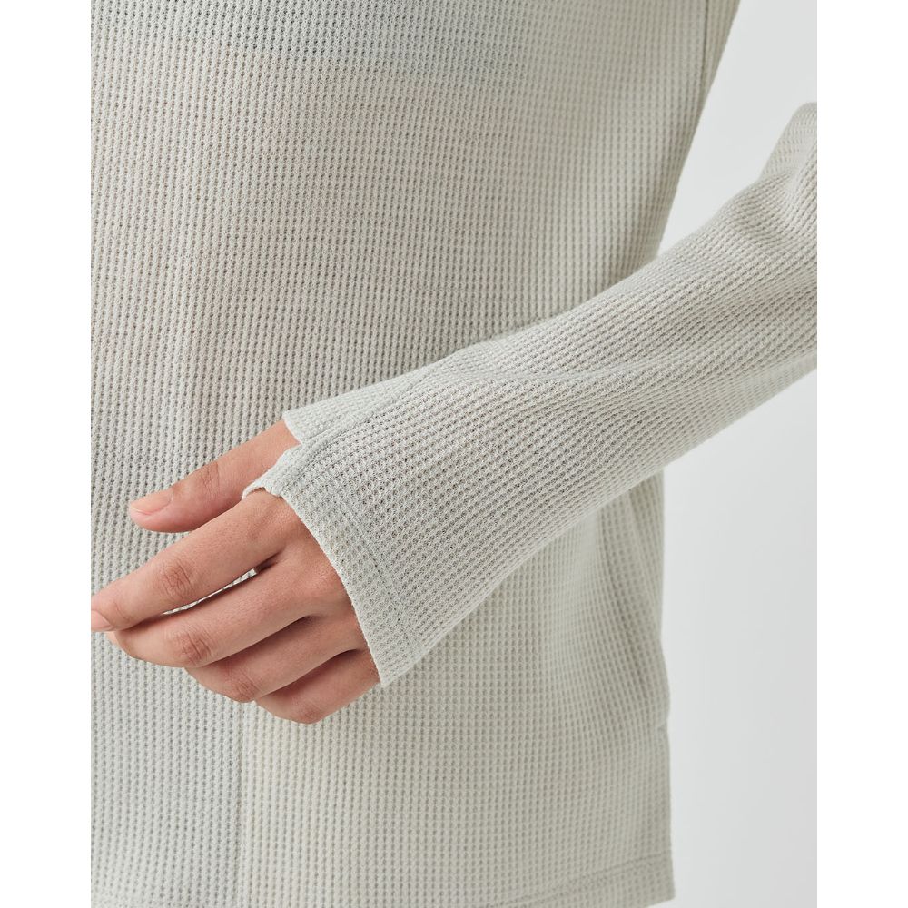 収縮性に富み凹凸のある編み地の為、肌に密着しすぎるのを防ぎ、生地と肌の間に空気の層を作り出すことで保温性を高めると同時に、さらっとした感触で快適な着心地を実現。