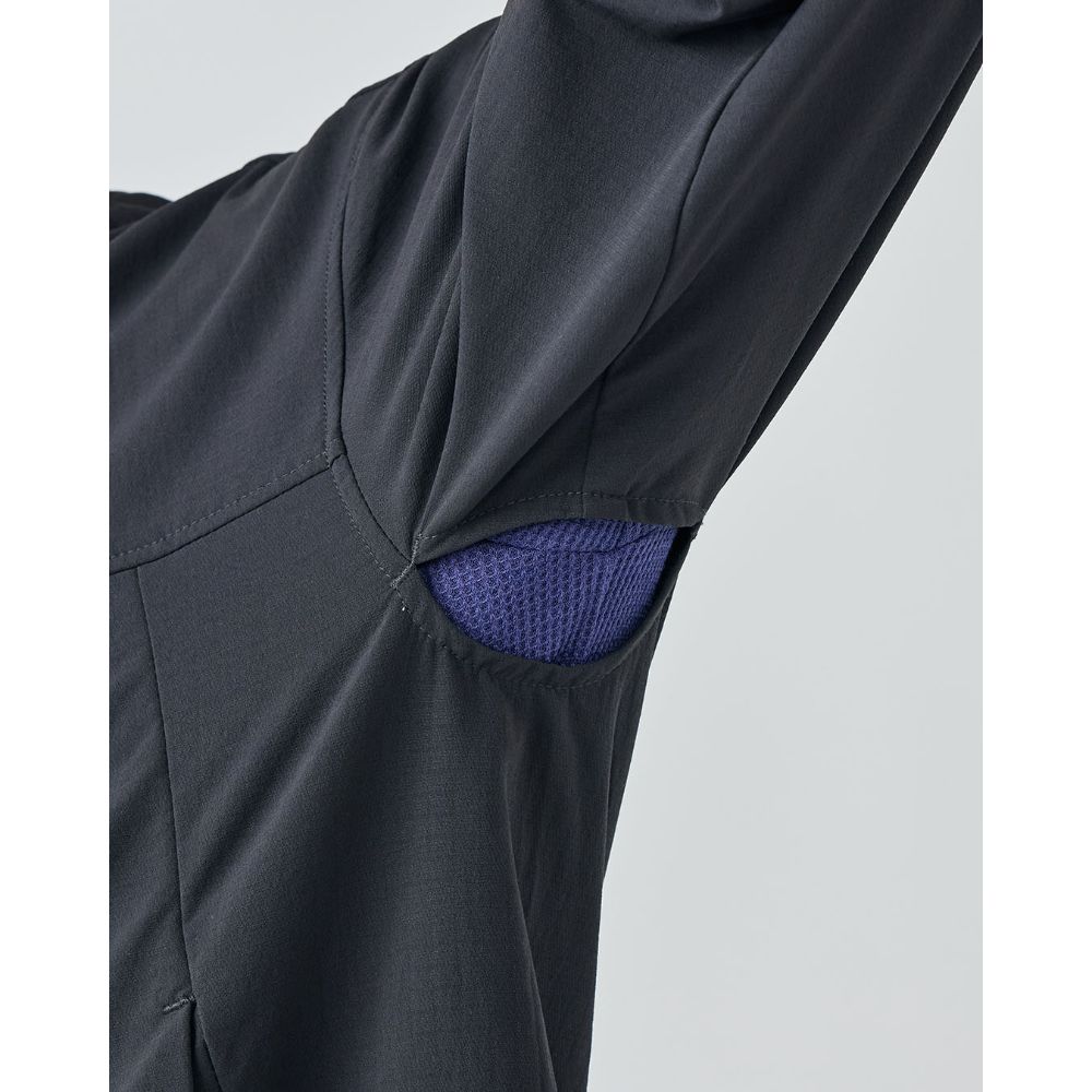 脇の下には、行動中にこもりがちな熱や湿気を逃がすベンチレーションを装備。