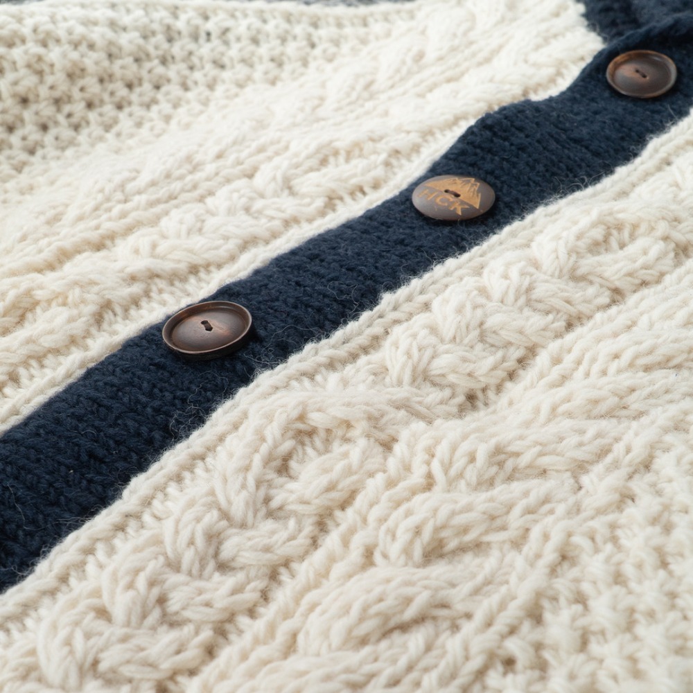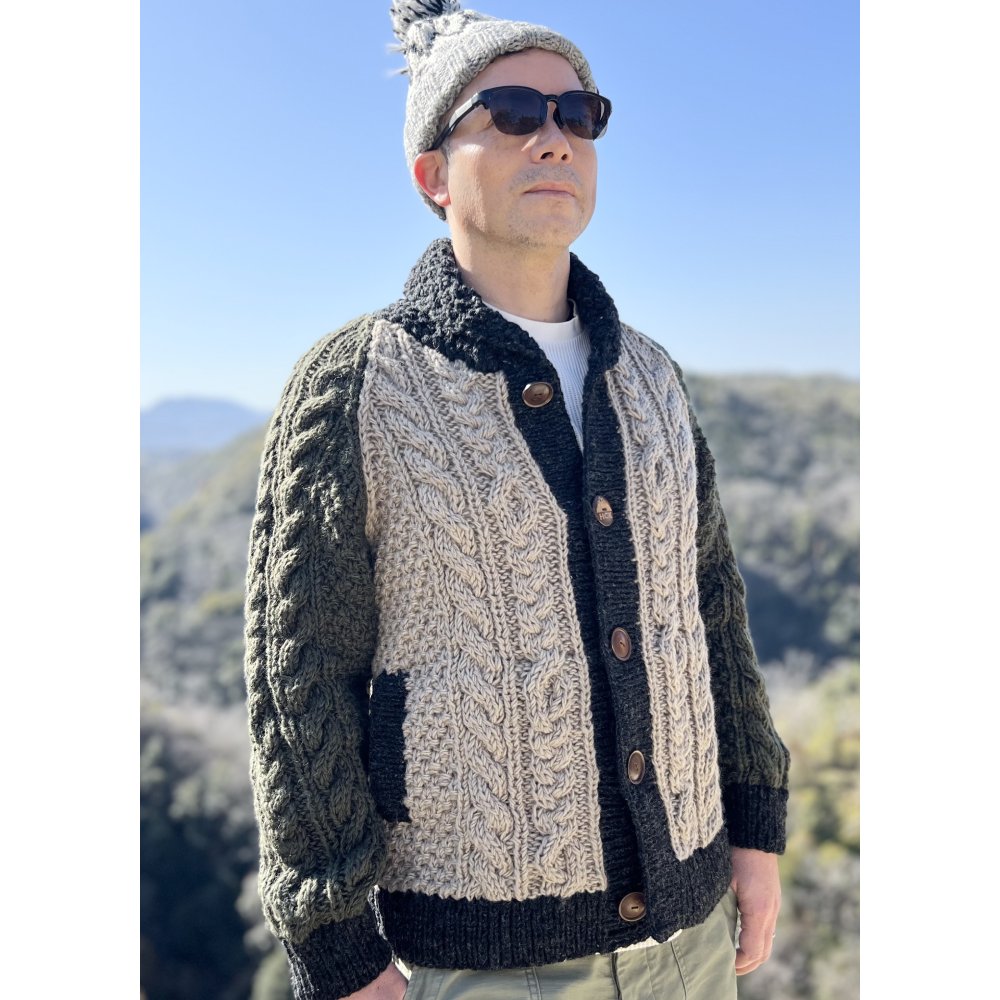 - ハンドメイドの温かみを感じられるこのショ-ルカ-ディガンは独特なデザインと色使いで他と一線を画します。特に強調すべきは、すっきりとした小ぶりのショ-ル衿、水牛の角から削り出したボタン、立体感・重厚感のあるケーブル編み、落ち着いた色の配色切り替えが挙げられます。