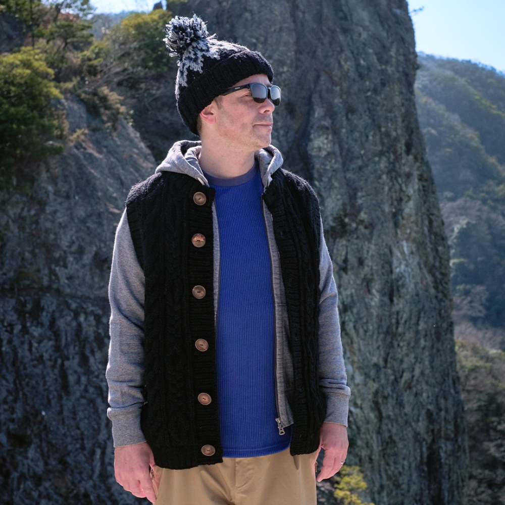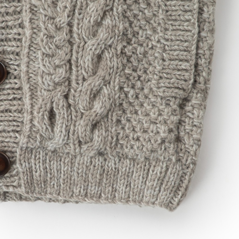 - 伝統的な手編みの技術を駆使して作られた立体感のあるケーブル模様が洗練された印象を与えます。前開き仕様で腰にある特徴的なポケット、水牛の角から削り出したボタンが差別化されたデザインとなっています。