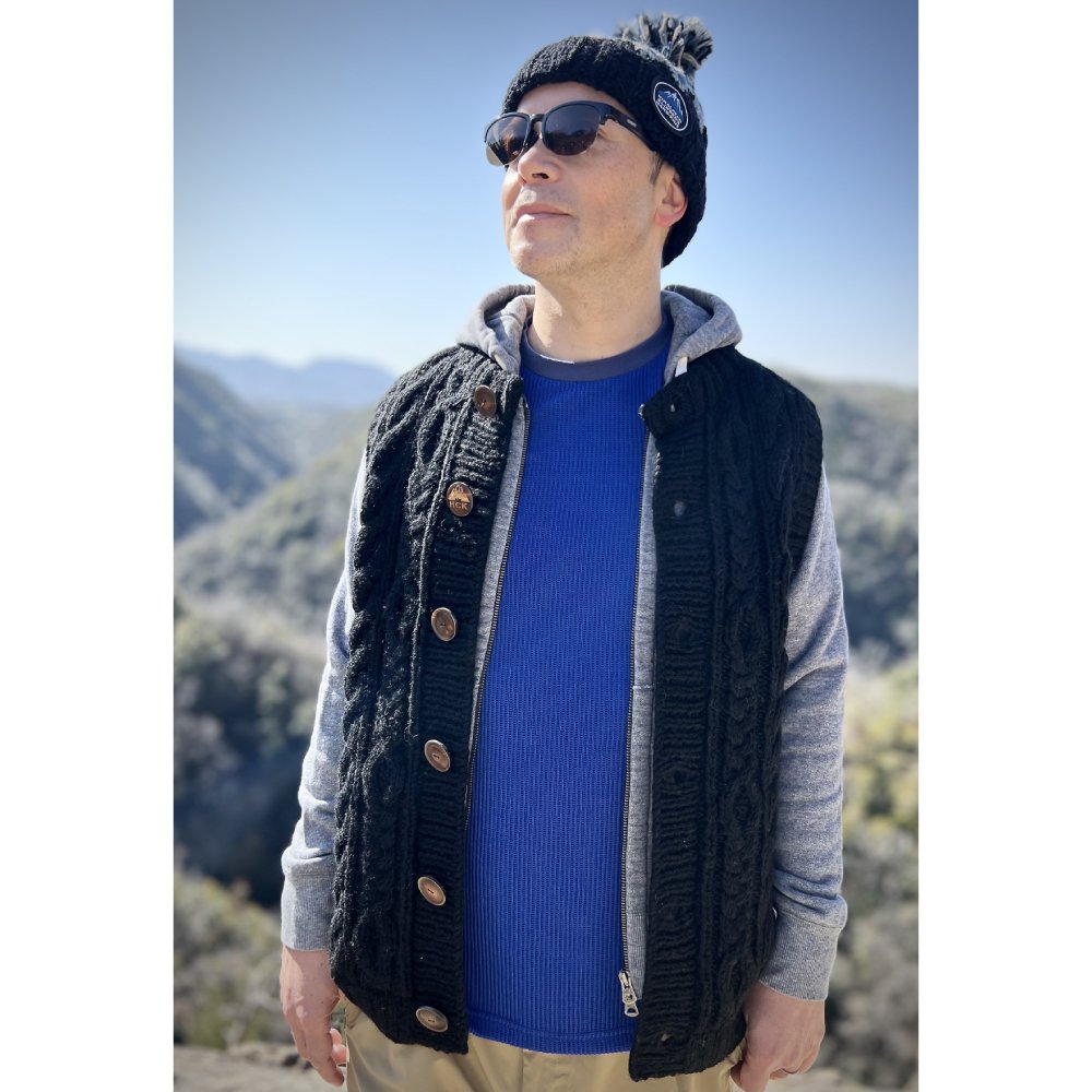 - 伝統的な手編みの技術を駆使して作られた立体感のあるケーブル模様が洗練された印象を与えます。前開き仕様で腰にある特徴的なポケット、水牛の角から削り出したボタンが差別化されたデザインとなっています。