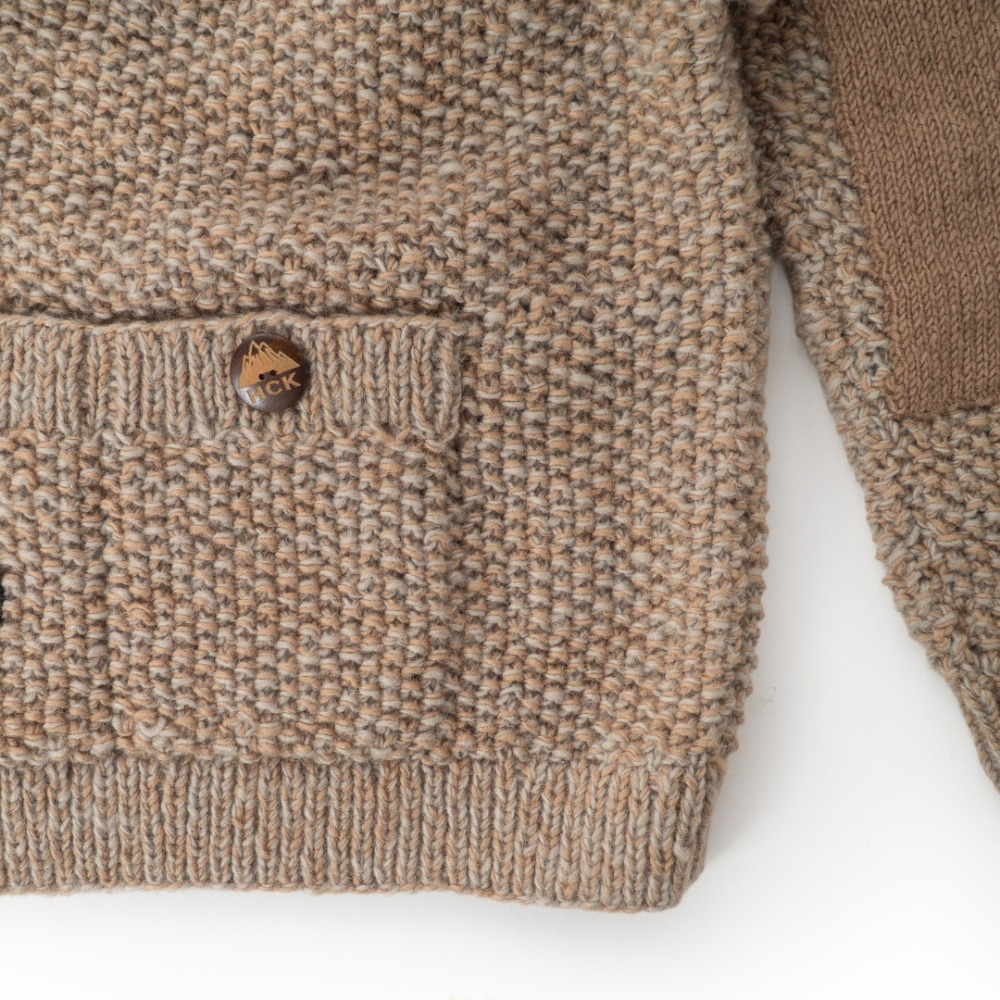 - このクルーセーターは、伝統的な手編みの技術を駆使して作られています。特に強調すべきは、程よいフィット感のクル-ネック、腰にある特徴的なポケット、水牛の角から削り出したボタン、立体感・重厚感のあるケーブル編み、配色切替のエルボ-パッチ、カラ-バリエ-ションの豊富さが挙げられます。