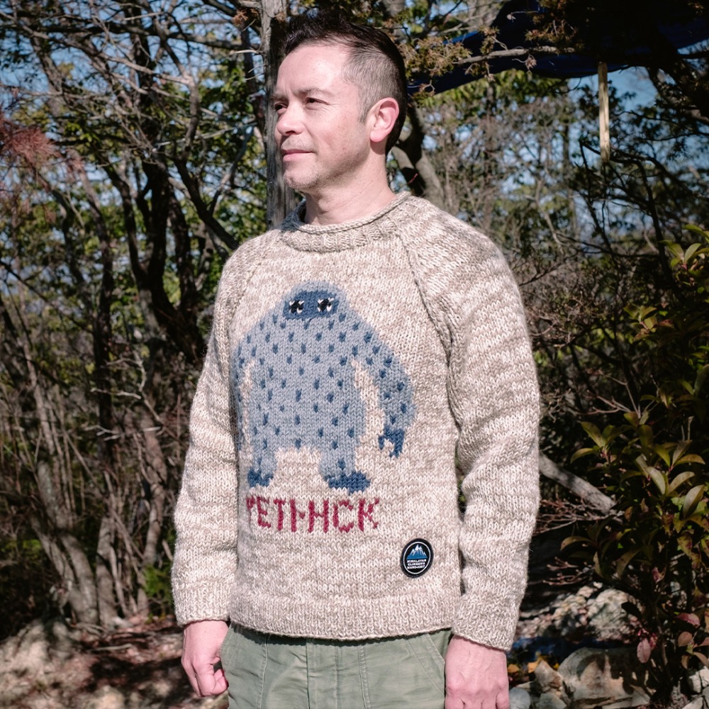- このクル-セ-タ-は前身頃に大きなモチ-フをデザインし、伝統的な手編みの技術を駆使しながらもトレンド感のあるアイテムが出来上がりました。モチ-フにはヒマラヤで目撃された雪男(YETI)を採用しました。