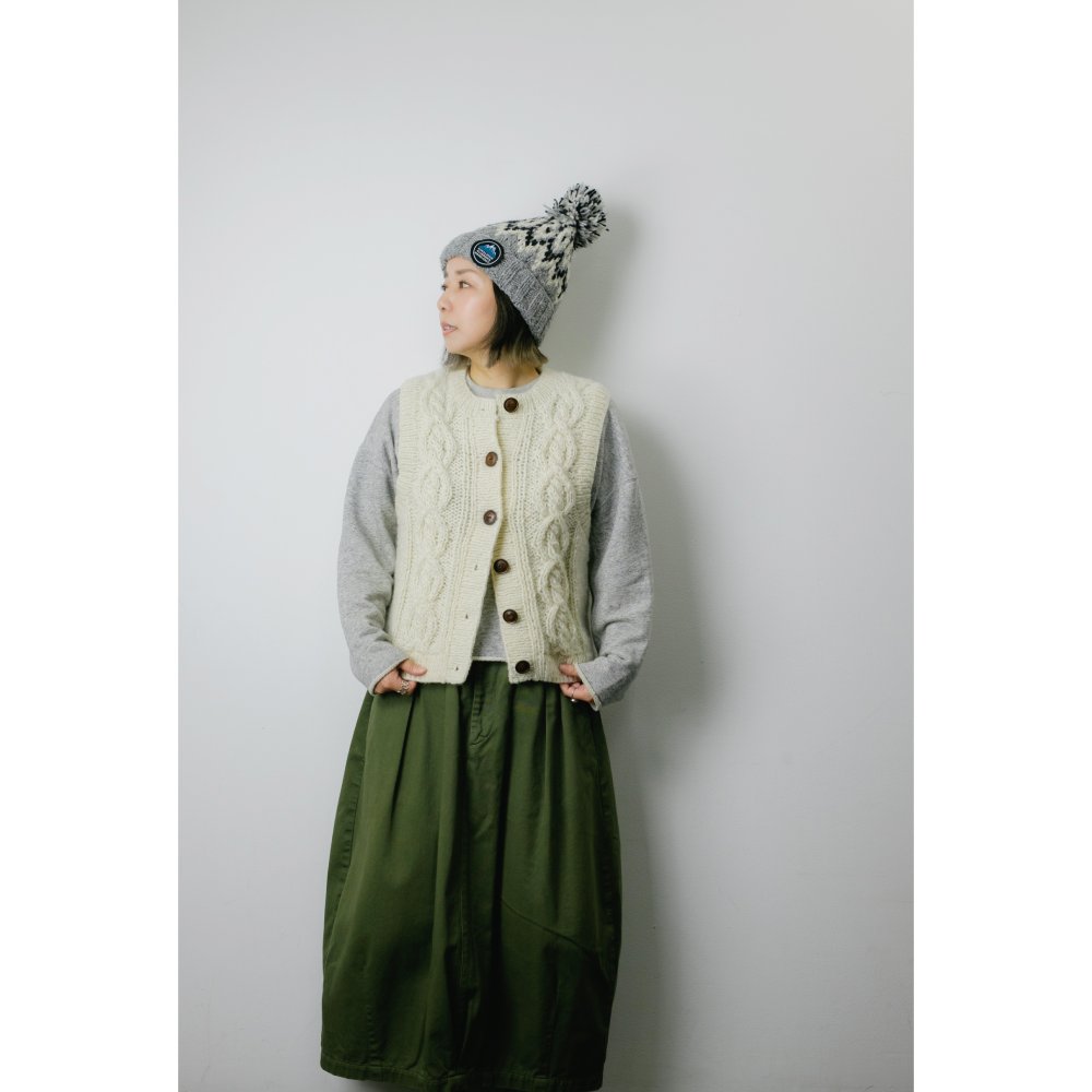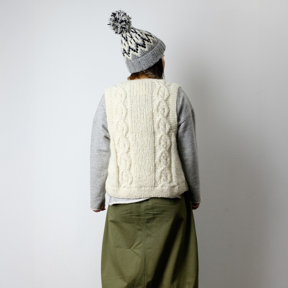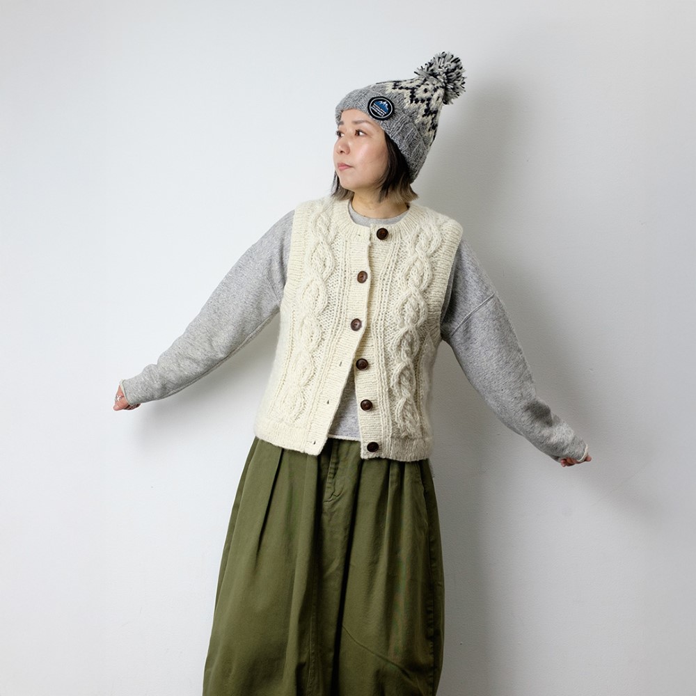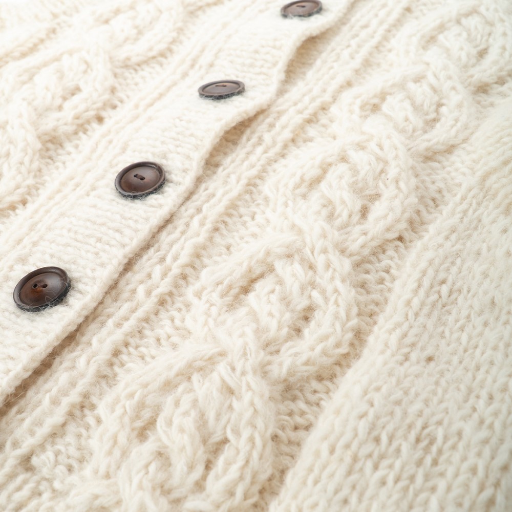 - 伝統的な手編みの技術を駆使して作られた立体感あるケーブル模様が洗練された印象を与えます。前開き仕様で、水牛の角から削り出したボタンが差別化されたデザインとなっています。