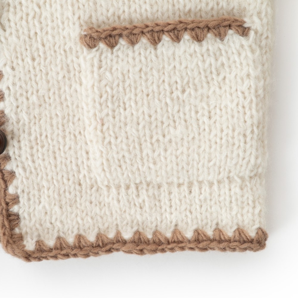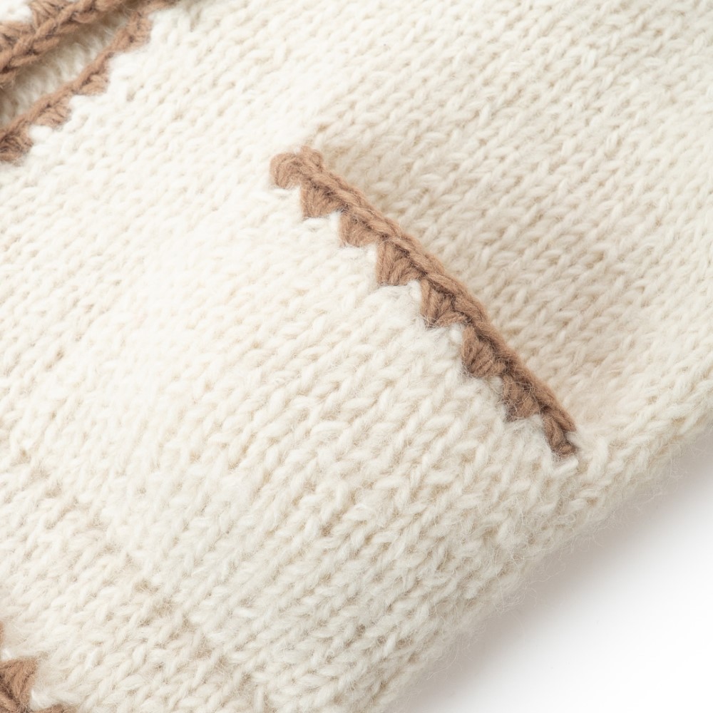 - ハンドメイドの温かみを感じられるこのクルーカ-ディガンは独特なデザインで他と一線を画します。特に強調すべきは、程よいフィット感のクルー衿、水牛の角から削り出したボタン、かぎ針を用いた配色デザイン、暖かみのあるナチュラルな色目が挙げられます。