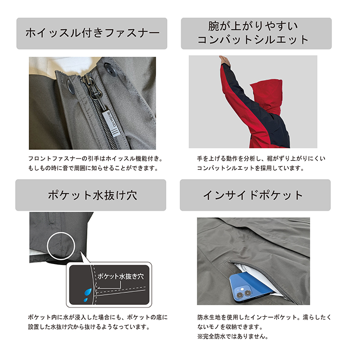 - 腕が上げやすく、動きやすい。悪天候下での行動を支えるため、さらに進化した3レイヤーレインウェア
