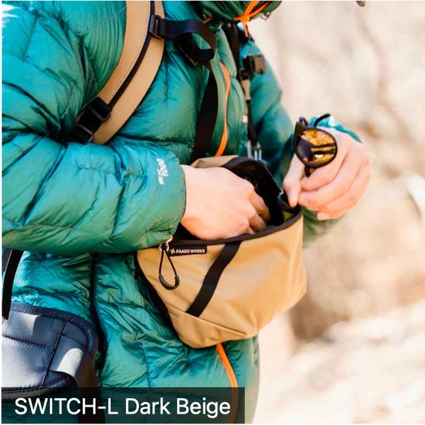 SWITCHの背面スリットにザックのウエストベルトを通して、サイドポケットとして使う事もできます。