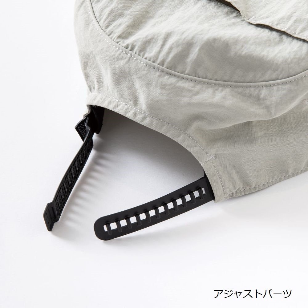紫外線遮蔽率の高い生地(UPF50+)には耐久はっ水加工、吸水速乾性のある頭周りの汗止めテープには抗菌防臭加工(SEK認証)が施されている。