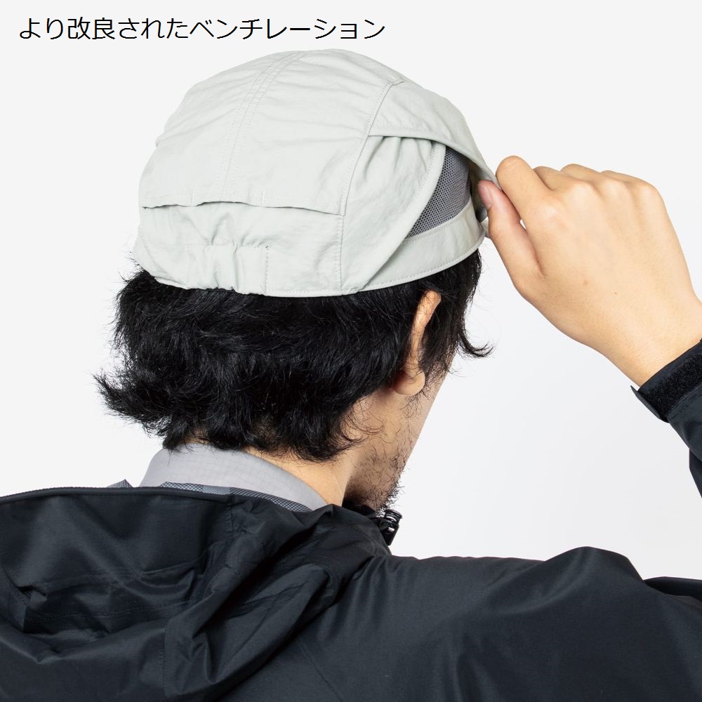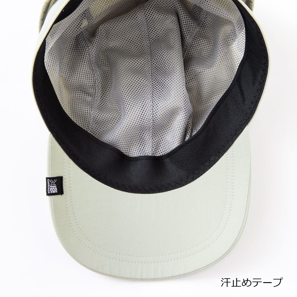 UVカット性に優れた本体生地(UPF50+)には耐久はっ水加工、頭周りの汗止めテープには抗菌防臭加工(SEK認証)が施されている。
