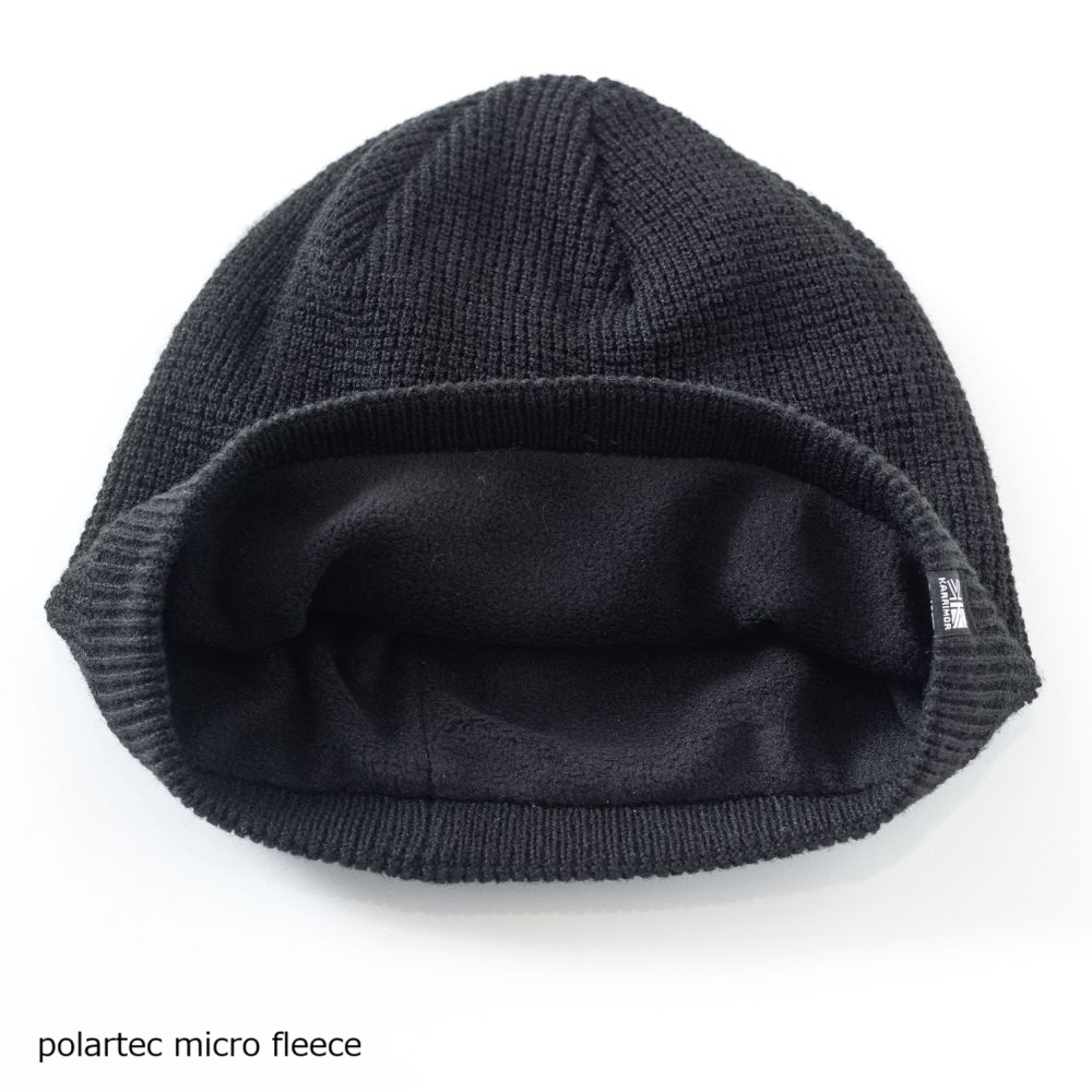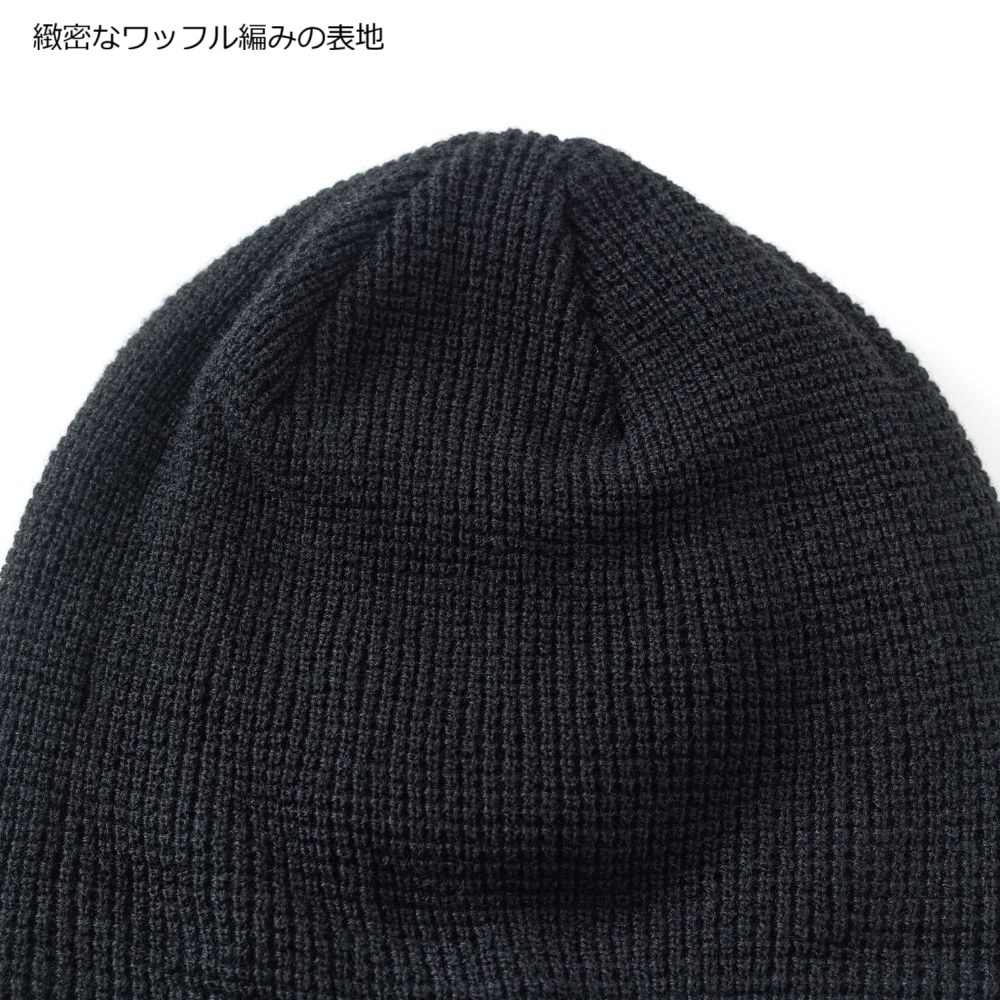 ウールブレンドの糸を緻密なワッフル編みにした表地に、密度が高く、保温性に優れたフリースをライニングしたビーニー。