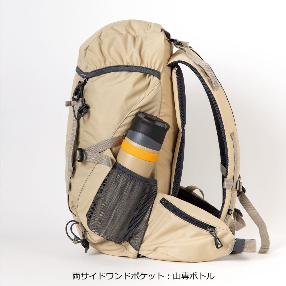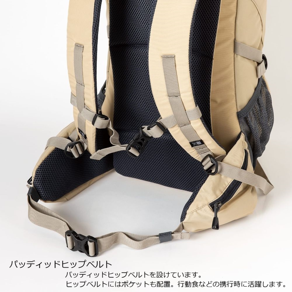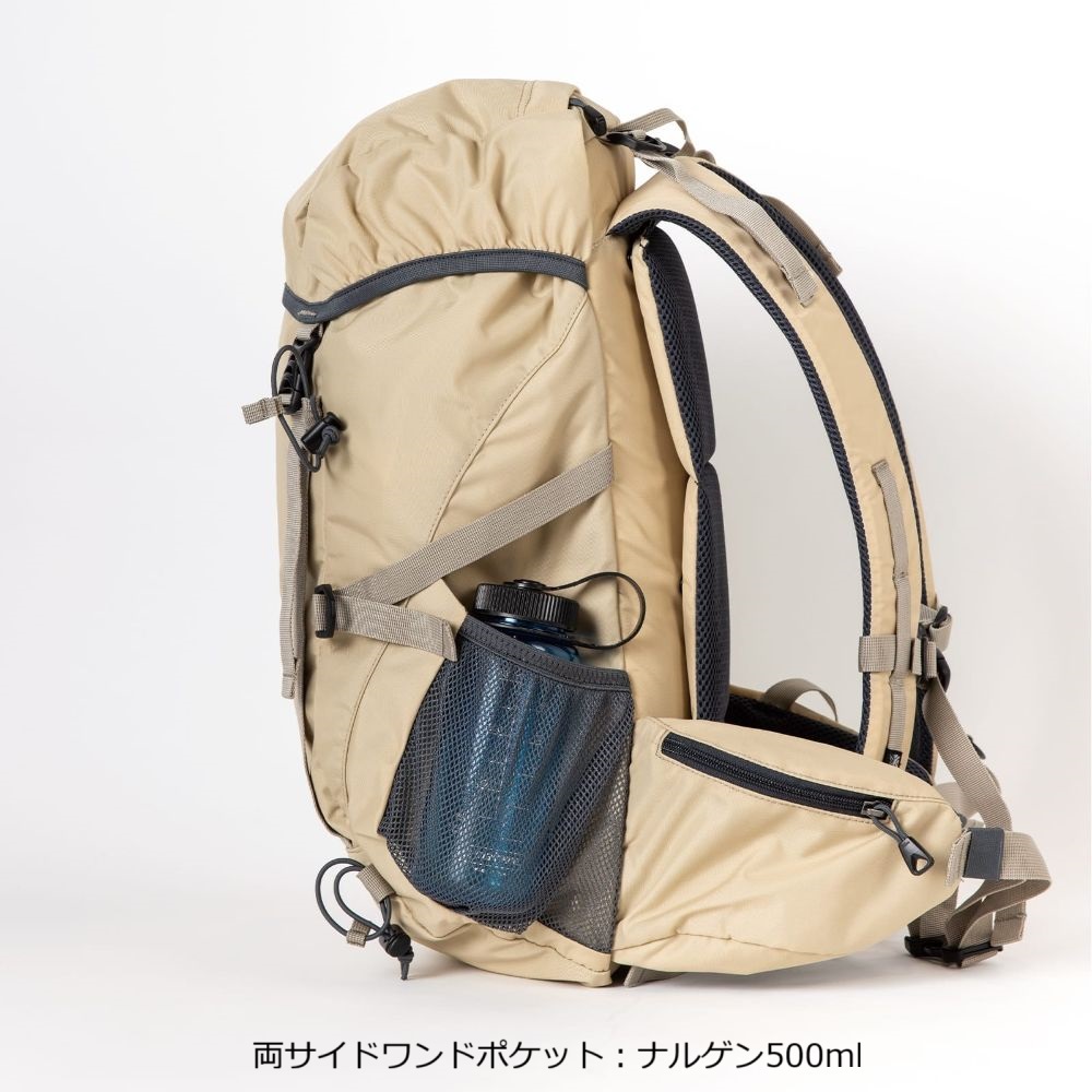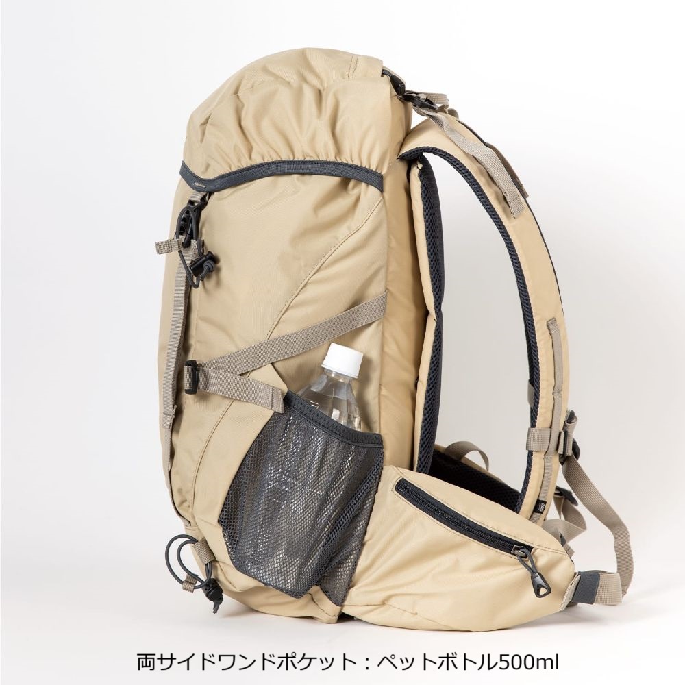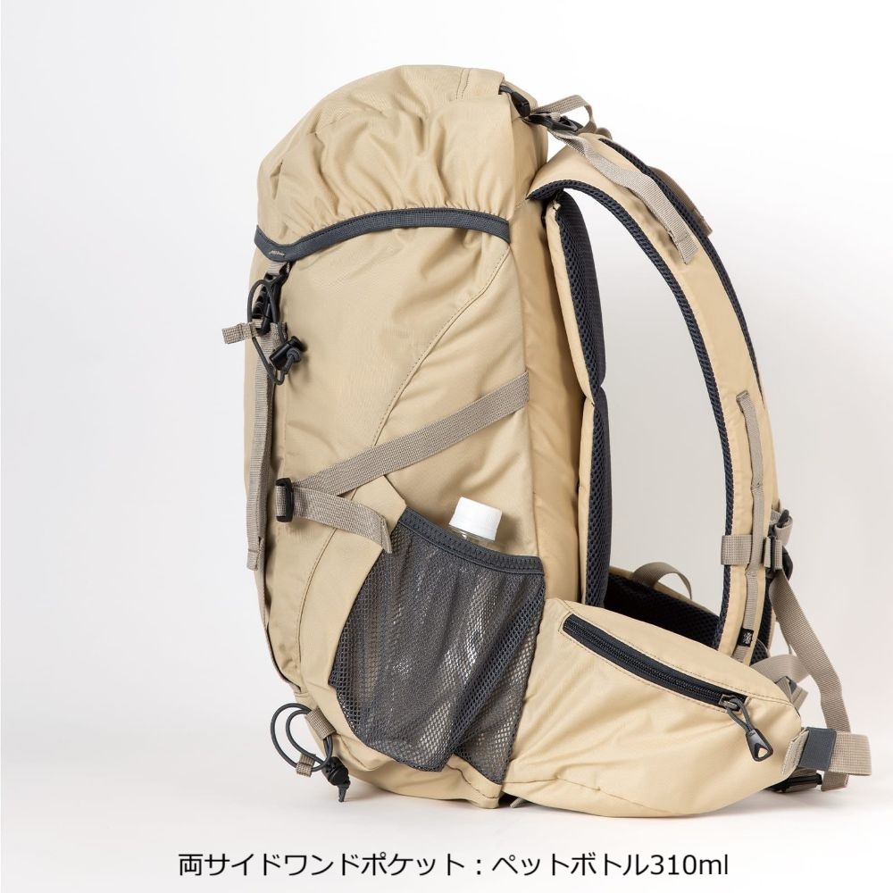パッド入りヒップベルトにポケットを装備、大き目のワンドポケット、フロントポケットなどトレッキング用で活躍する機能を多数装備した機能充実の小型トップローダー。