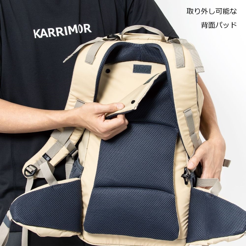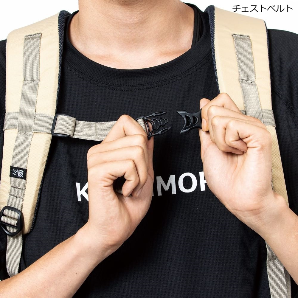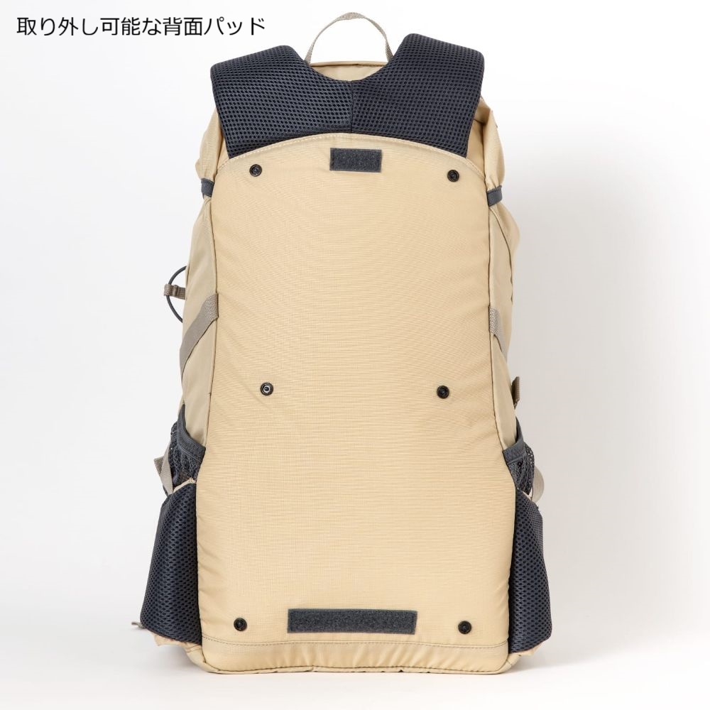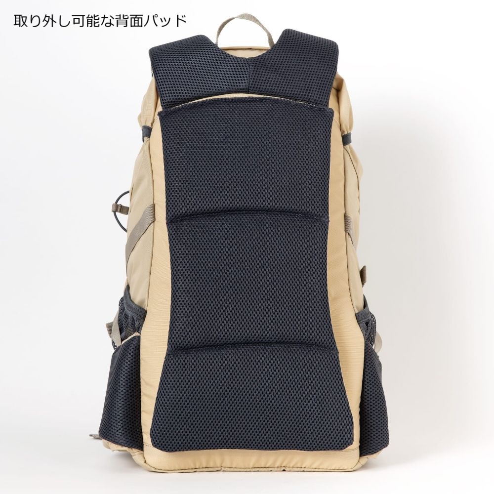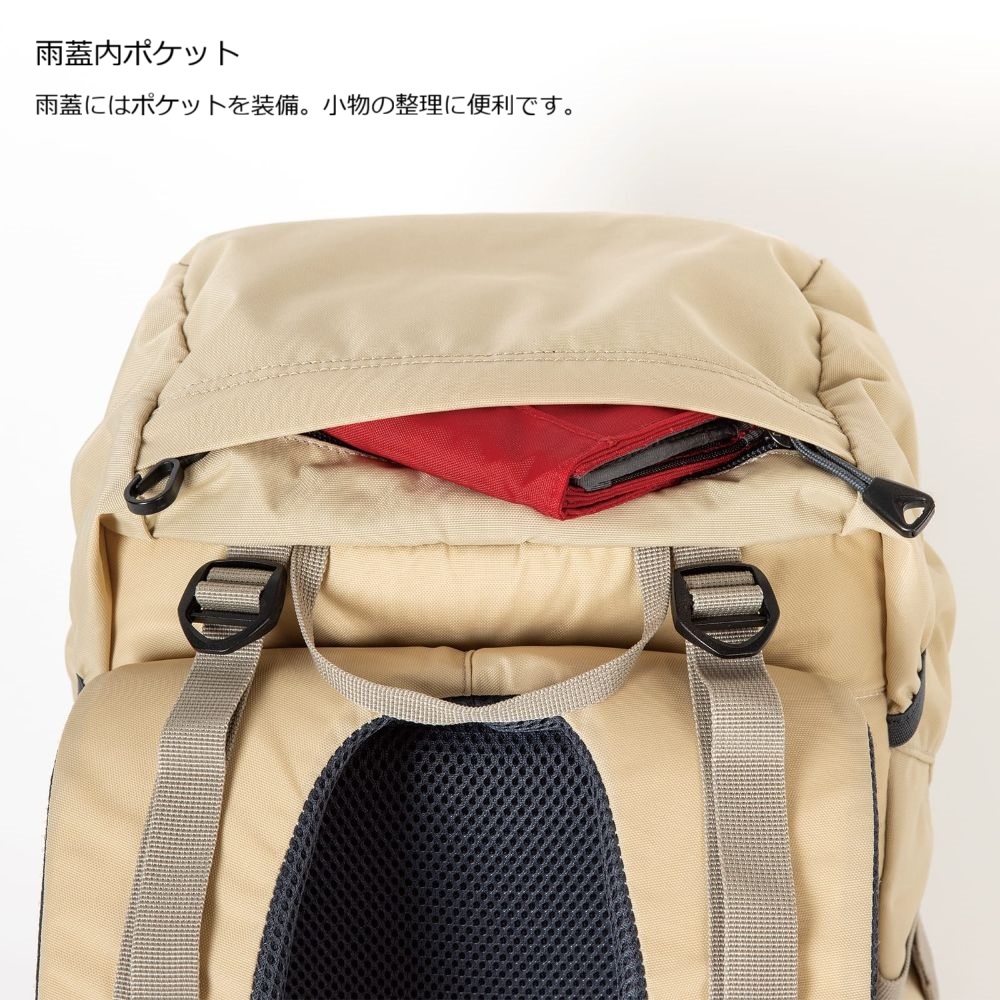 パッド入りヒップベルトにポケットを装備、大き目のワンドポケット、フロントポケットなどトレッキング用で活躍する機能を多数装備した機能充実の小型トップローダー。