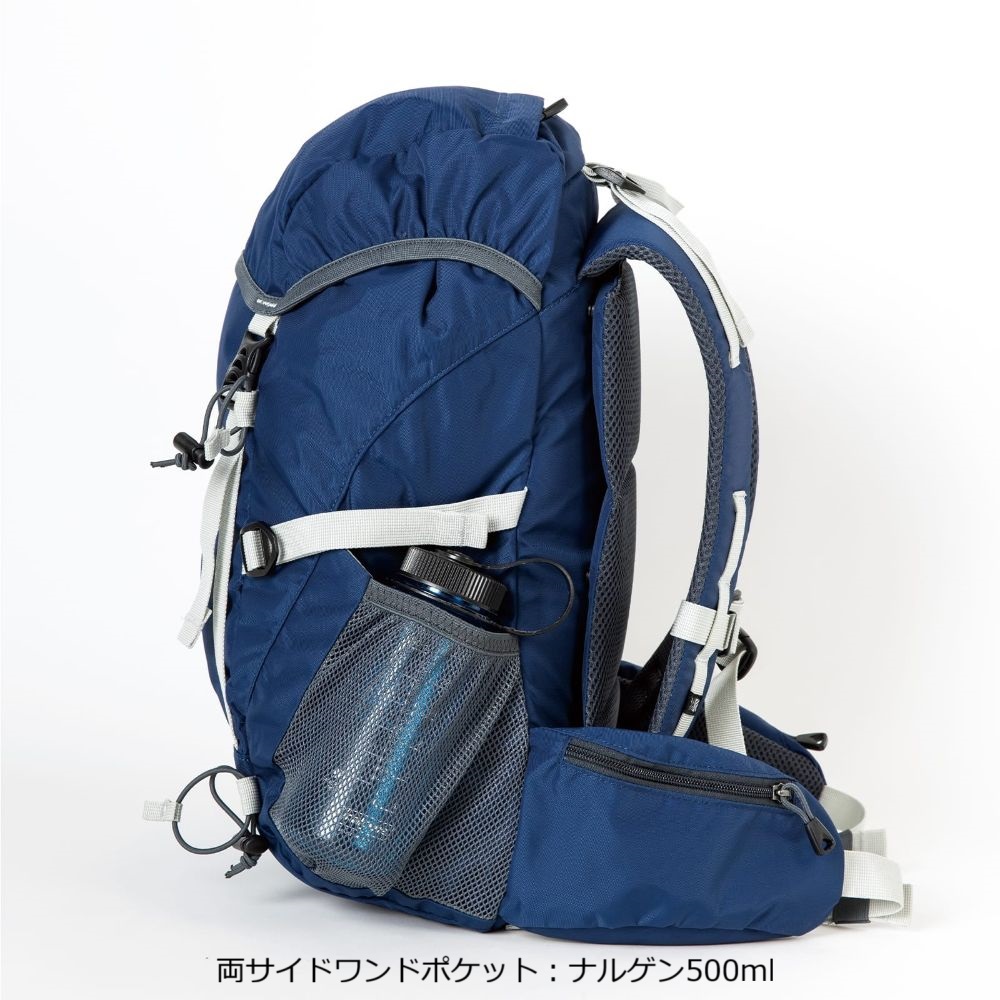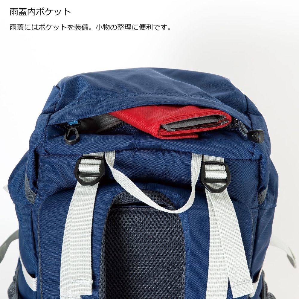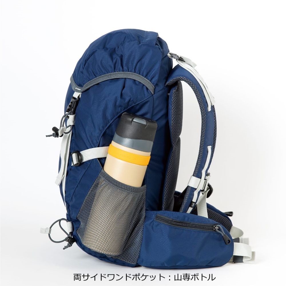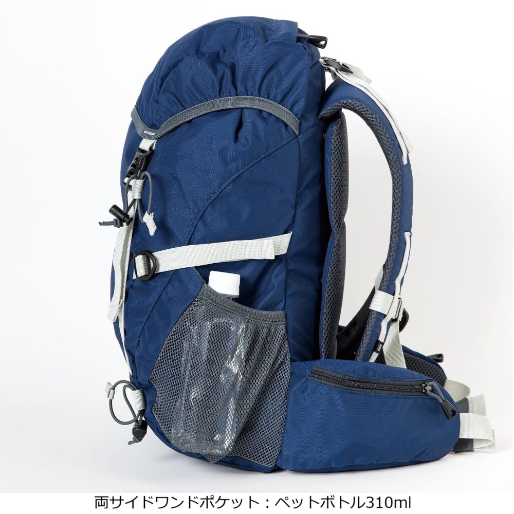 パッド入りりヒップベルトにポケットを装備、大き目のワンドポケット、フロントポケットなどトレッキング用で活躍する機能を多数装備した機能充実の小型トップローダー。
