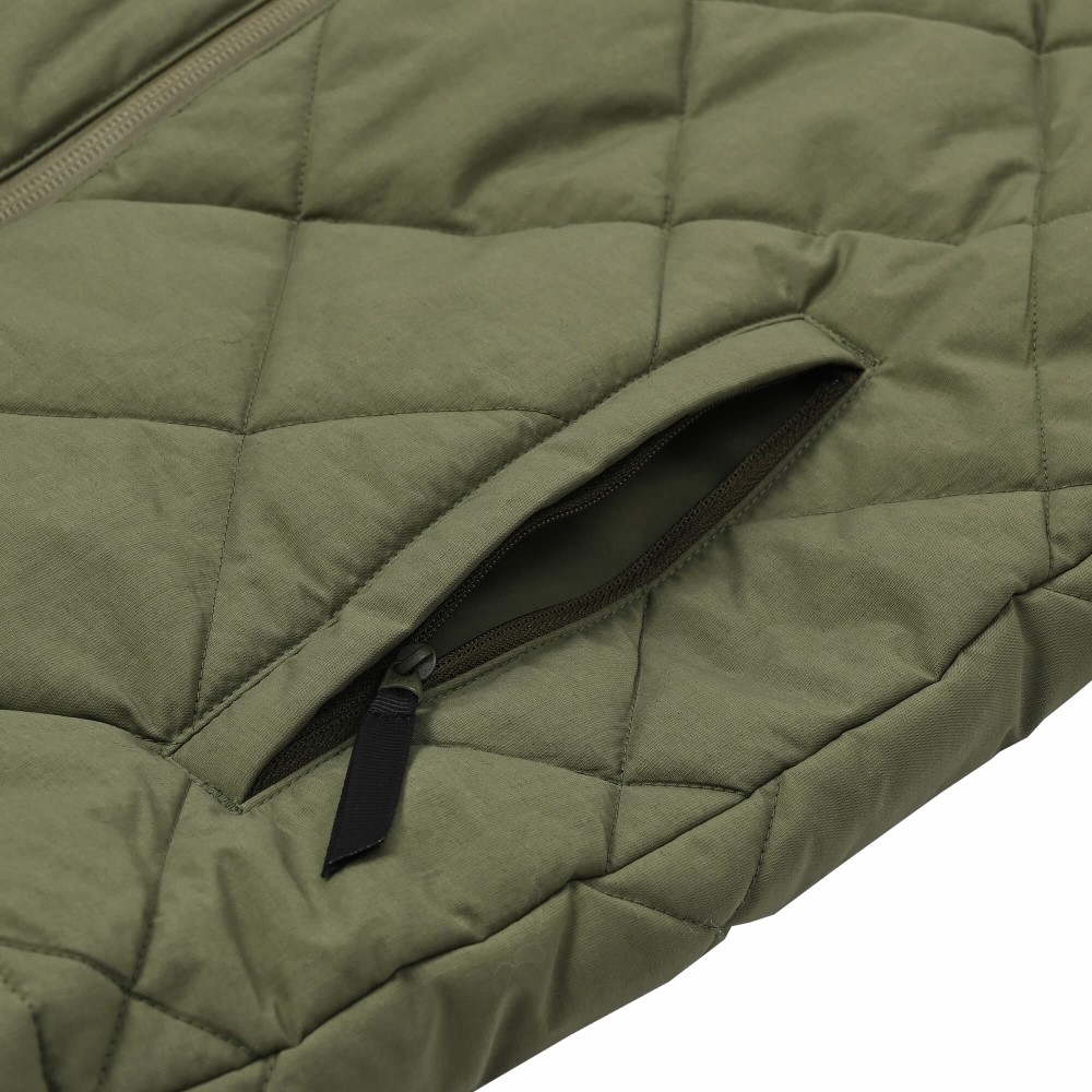 表地にはPertex® Unlimitedを使用し、中綿にはプリマロフト®を封入したキルティングインサレーションジャケット。タスラン糸を用いたPertex®生地はドライなタッチで日常使いにもマッチし、優れた耐久撥水性を備えています。中綿に使用しているプリマロフト®は、人工繊維による擬似羽毛素材。羽毛のように軽量で暖かい保温性と柔軟性を発揮するだけでなく、羽毛にはない撥水性を持ち合わせた高機能な素材です。左前の全開ファスナーによる着脱のしやすさに加え、ドットボタンの前開きで首元の調整も可能。クラシカルなデザインは、アウトドアシーンはもちろん、デイリーコーディネートにも馴染む汎用性の高い1着です。