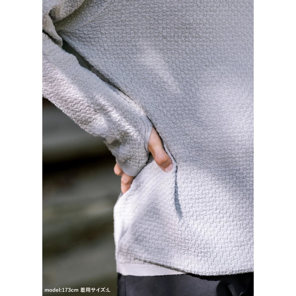 特徴的な凸凹した表面感は、体温を衣類の中にしっかりとキープします。また縫い目がないので素肌に着てもゴロつきにくく、素肌の上に着た時に最高の機能を発揮します。