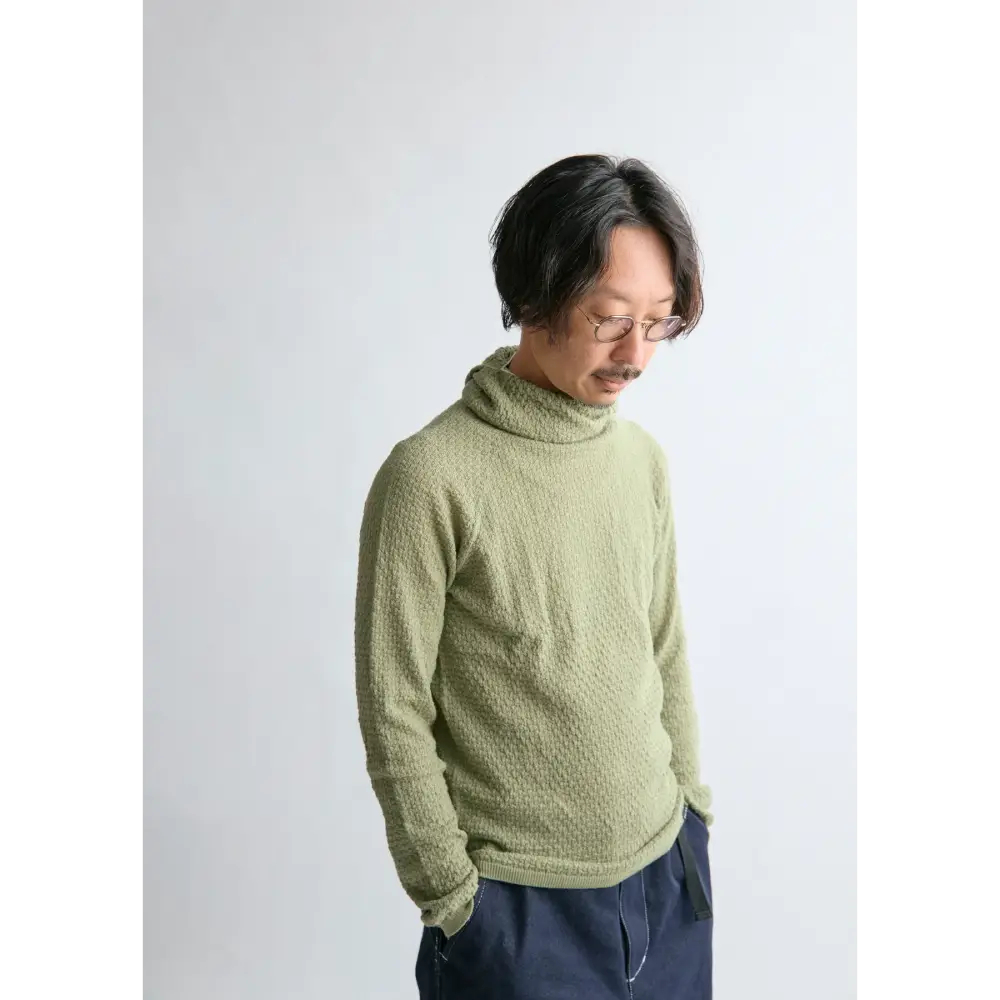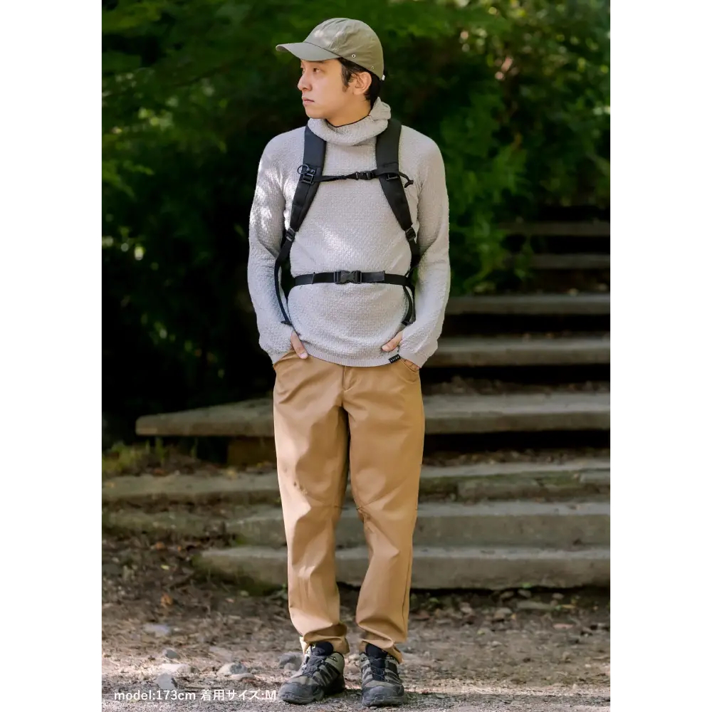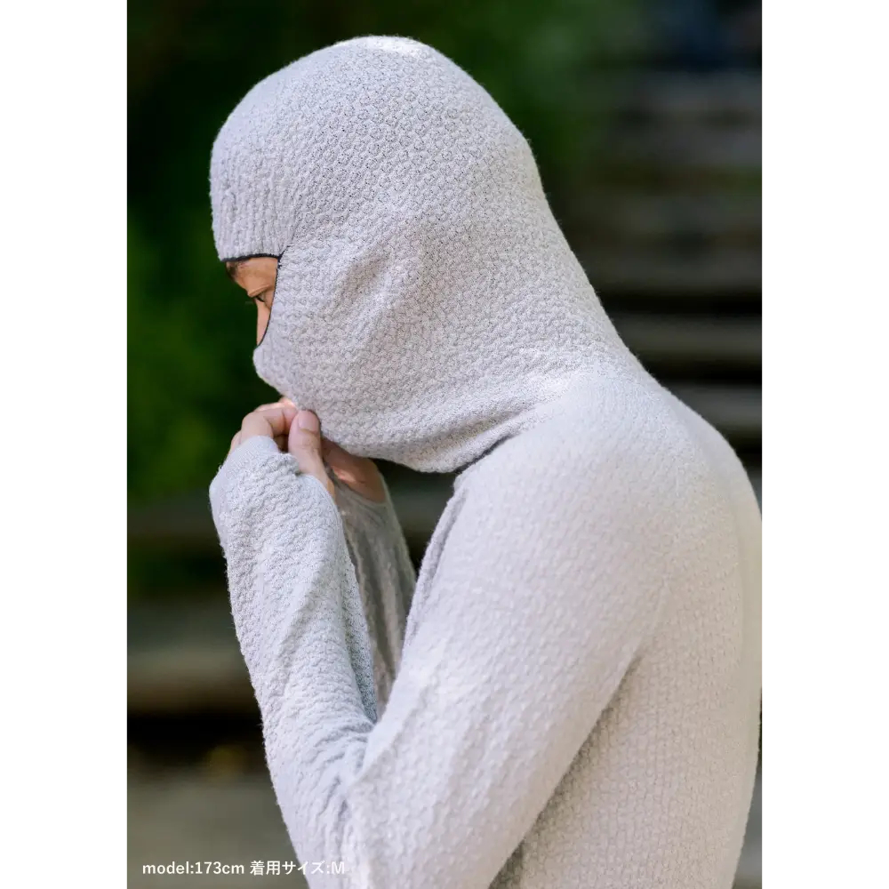 顔まで覆うバラクラバスタイルのフードを備えているので、首周りの防寒性も高く、特徴的な凸凹した表面感は、体温を衣類の中にしっかりとキープします。また縫い目がないので素肌に着てもゴロつきにくく、素肌の上に着た時に最高の機能を発揮します。
