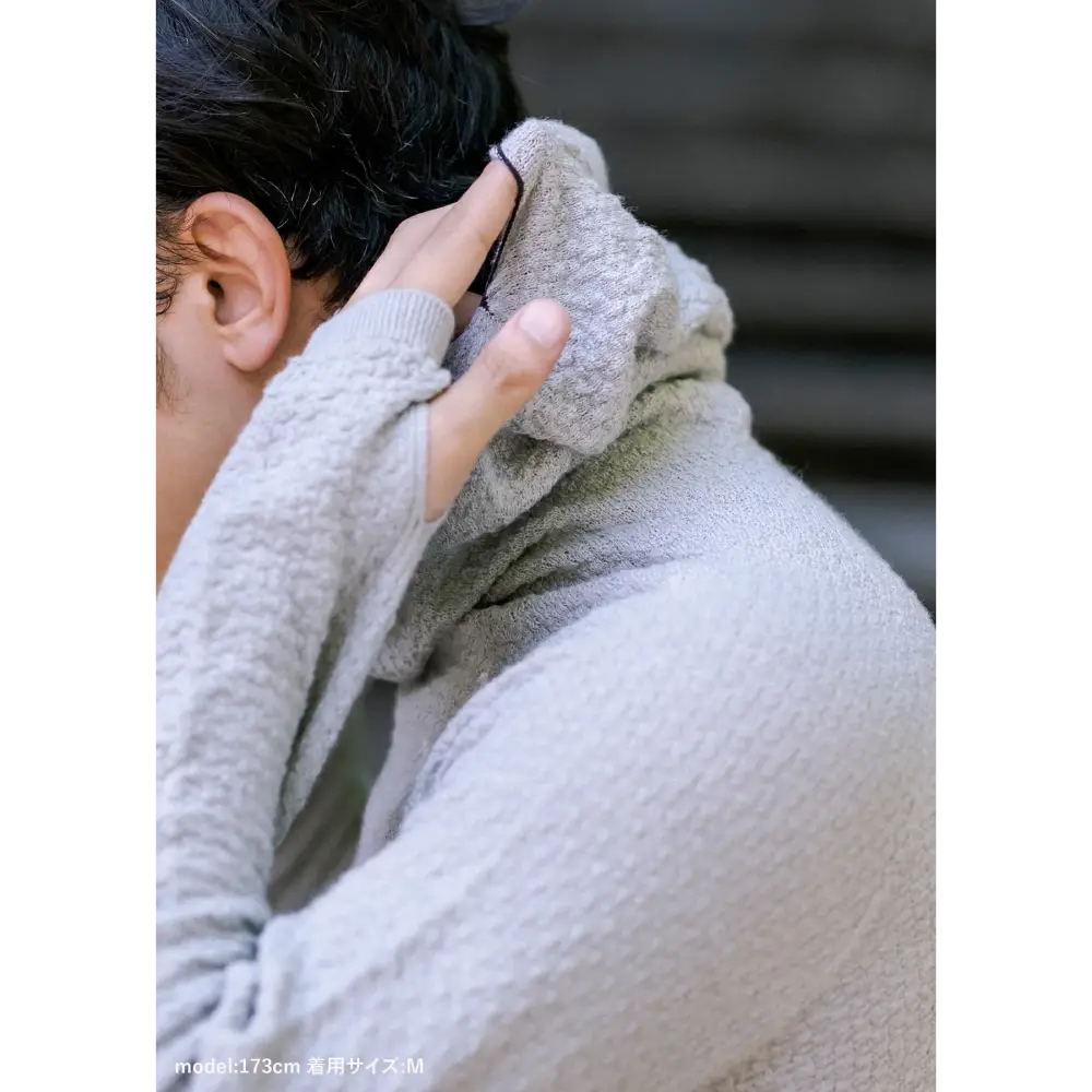 顔まで覆うバラクラバスタイルのフードを備えているので、首周りの防寒性も高く、特徴的な凸凹した表面感は、体温を衣類の中にしっかりとキープします。また縫い目がないので素肌に着てもゴロつきにくく、素肌の上に着た時に最高の機能を発揮します。