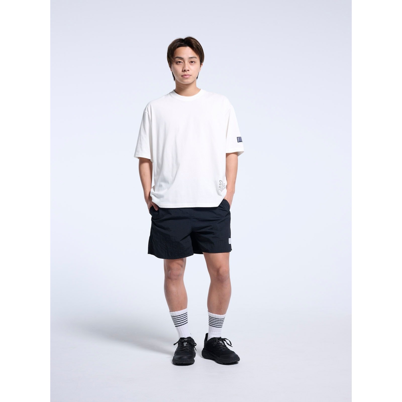 表面には綿、裏面には速乾性に優れたリサイクルポリエステルを使用。独特な編地のプレーティング天竺を採用。左裾にシンプルなプリントを配したワイドシルエットのカジュアルTシャツ。