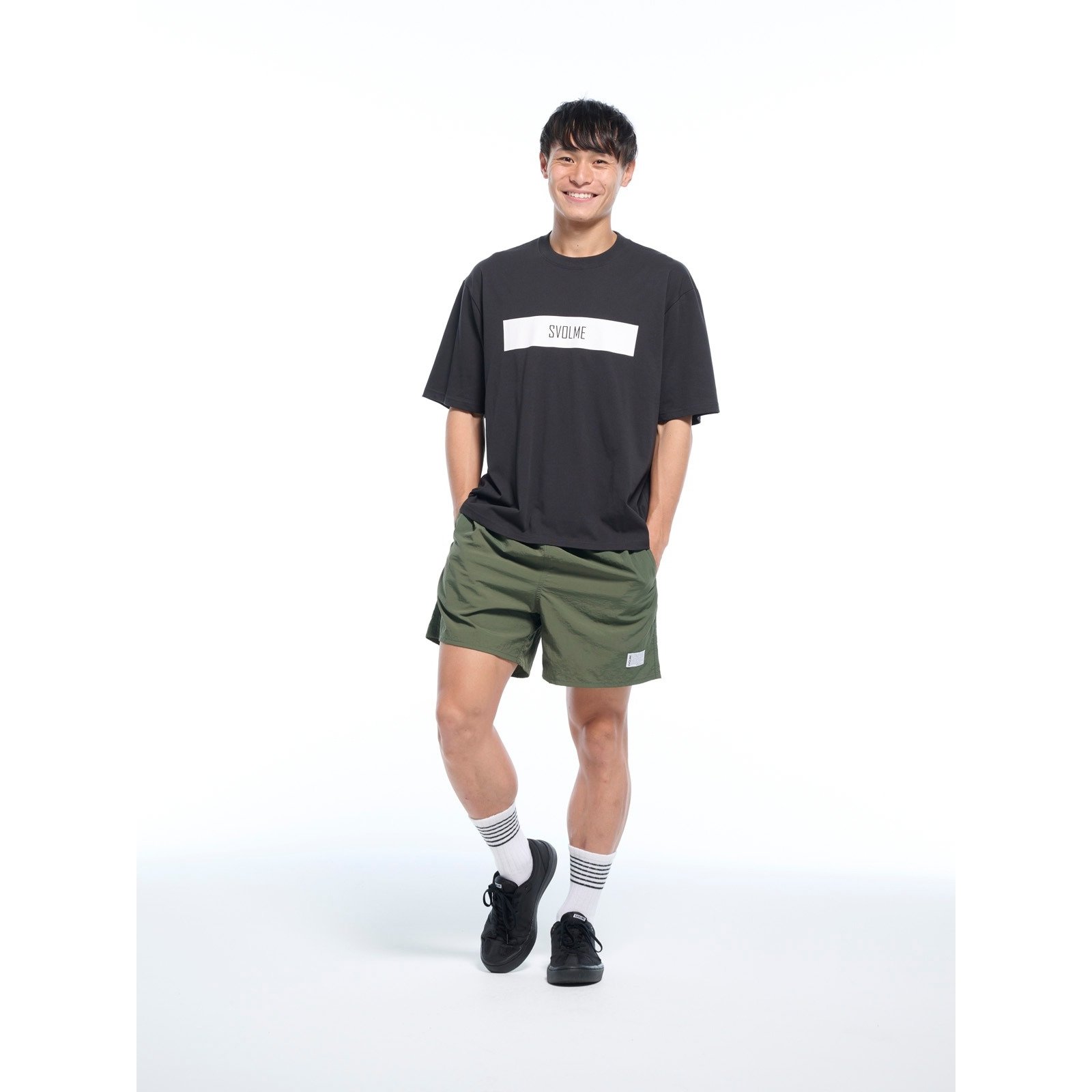 表面には綿、裏面には速乾性に優れたリサイクルポリエステルを使用。独特な編地のプレーティング天竺を採用。胸にテープ調のSVOLMEロゴをプリントを配したワイドシルエットのカジュアルTシャツ。