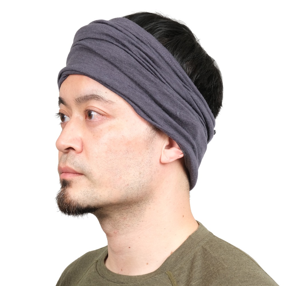 気温が低い朝の歩き始めに首まわりを保温したいとき、頬に当たる冷たい風を和らげたいとき、帽子を脱いで汗を効率よく放出させながら髪の毛を押さえたいときなどに使用できます。